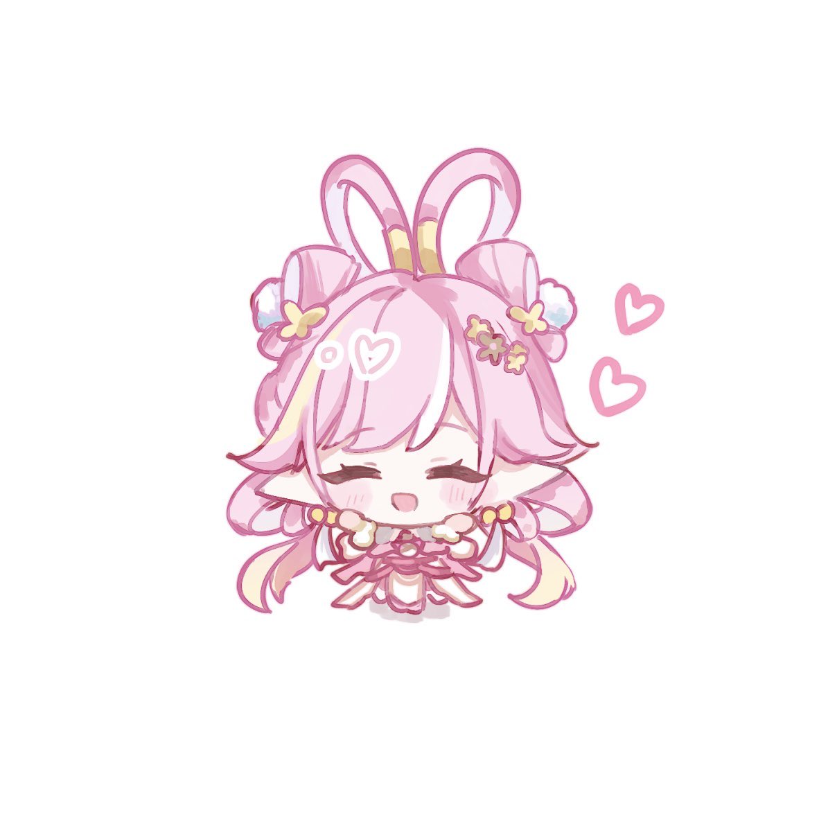 1girl chibi chibi_only chinese_hairstyle commentary elf elysia_(hi_love_elf)_(honkai_impact) elysia_(honkai_impact) elysia_(lunar_grace)_(honkai_impact) feixianji_(hairstyle) hair_rings heart honkai_(series) honkai_impact_3rd long_hair open_mouth pink_hair pointy_ears shuangyaji simple_background smile solo tdatnst untranslatable_commentary very_long_hair white_background