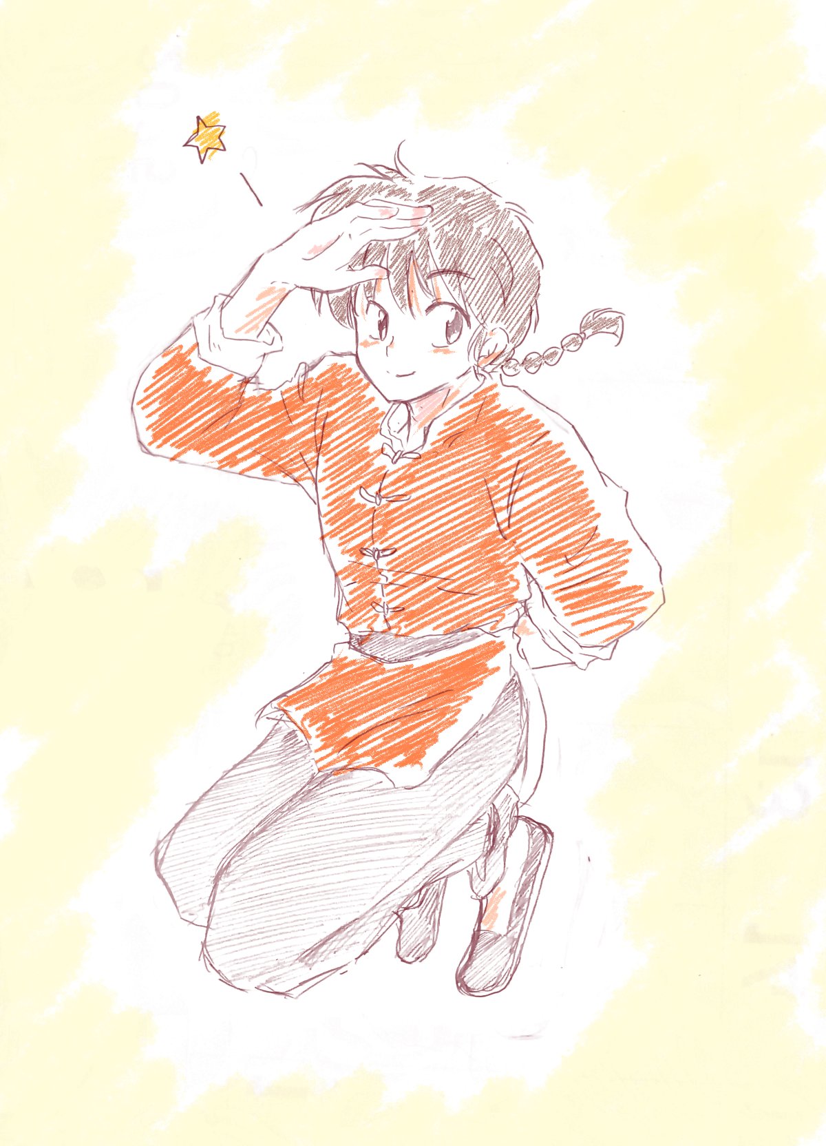 1boy arm_behind_back arm_up black_eyes black_hair braid chinese_clothes closed_mouth commentary_request full_body fuwariko highres male_focus ranma_1/2 saotome_ranma single_braid smile yellow_background