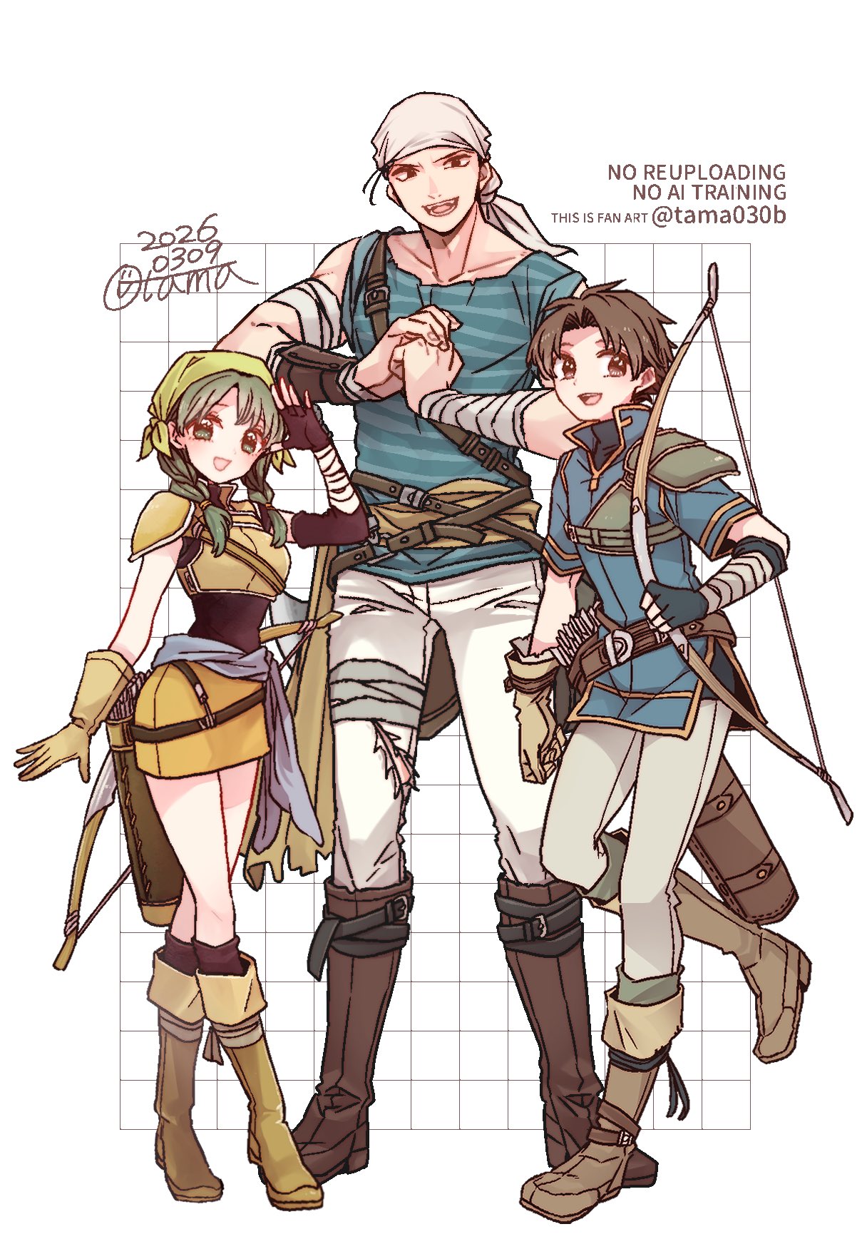 1girl 2boys armor arrow_(projectile) asymmetrical_gloves bandaged_arm bandages bandana belt black_shirt blue_shirt boots bow_(weapon) braid breastplate breasts brown_armor brown_belt brown_boots brown_eyes brown_gloves brown_hair brown_skirt commentary crossed_legs dart_(fire_emblem) dated elbow_gloves fingerless_gloves fire_emblem fire_emblem:_the_blazing_blade full_body gloves green_bandana green_eyes green_hair grey_armor grid_background high_collar highres holding holding_bow_(weapon) holding_weapon knee_boots leg_belt leg_up long_hair looking_at_viewer medium_breasts multiple_belts multiple_boys muscular muscular_male nintendo open_mouth pants parted_bangs quiver rebecca_(fire_emblem) sayu030b shirt short_hair short_sleeves shoulder_armor signature skirt sleeveless sleeveless_shirt smile standing standing_on_one_leg striped_clothes striped_shirt torn_clothes torn_pants twin_braids twintails twitter_username watermark watson_cross weapon weapon_on_back white_background white_bandana white_pants wil_(fire_emblem)