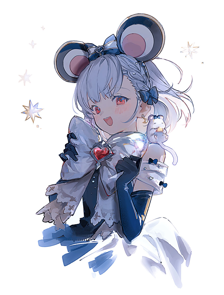 1girl animal animal_ears animal_on_shoulder bare_shoulders black_dress black_gloves blush bow bow_hairband brooch commentary cropped_torso dress earrings elbow_gloves fake_animal_ears gem gloves granblue_fantasy hair_bow hairband heart-shaped_gem highres iwashi_(morpho000) jewelry mouse_(animal) mouse_ears off-shoulder_dress off_shoulder open_mouth red_eyes red_gem simple_background small_stellated_dodecahedron solo untranslatable_commentary upper_body vikala_(12th_anniversary) vikala_(granblue_fantasy) white_background white_hair