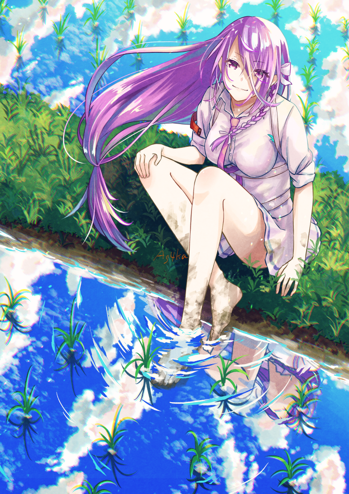 1girl braid commentary_request grass hair_tie heaven_burns_red kura_satomi long_hair looking_at_viewer multicolored_hair necktie oage_(o_ag_e4) pink_eyes pink_hair pink_necktie reflection rice_(plant) rice_paddy water white_hair