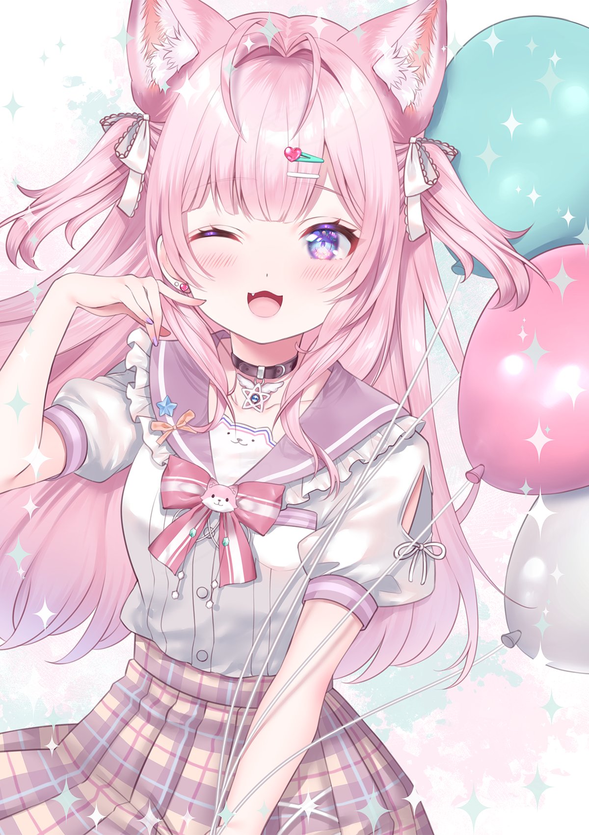 1girl animal_ears balloon blush bow collar commentary_request earrings fang hair_ornament hair_ribbon hairclip hakui_koyori hakui_koyori_(school_uniform) highres hololive jewelry long_hair looking_at_viewer one_eye_closed open_mouth pink_bow pink_hair pink_sailor_collar pink_skirt ribbon sailor_collar school_uniform serafuku short_sleeves skirt smile solo star_ornament tsukimochikuriko_(tsukimochi_k) two_side_up virtual_youtuber white_serafuku wolf_ears wolf_girl