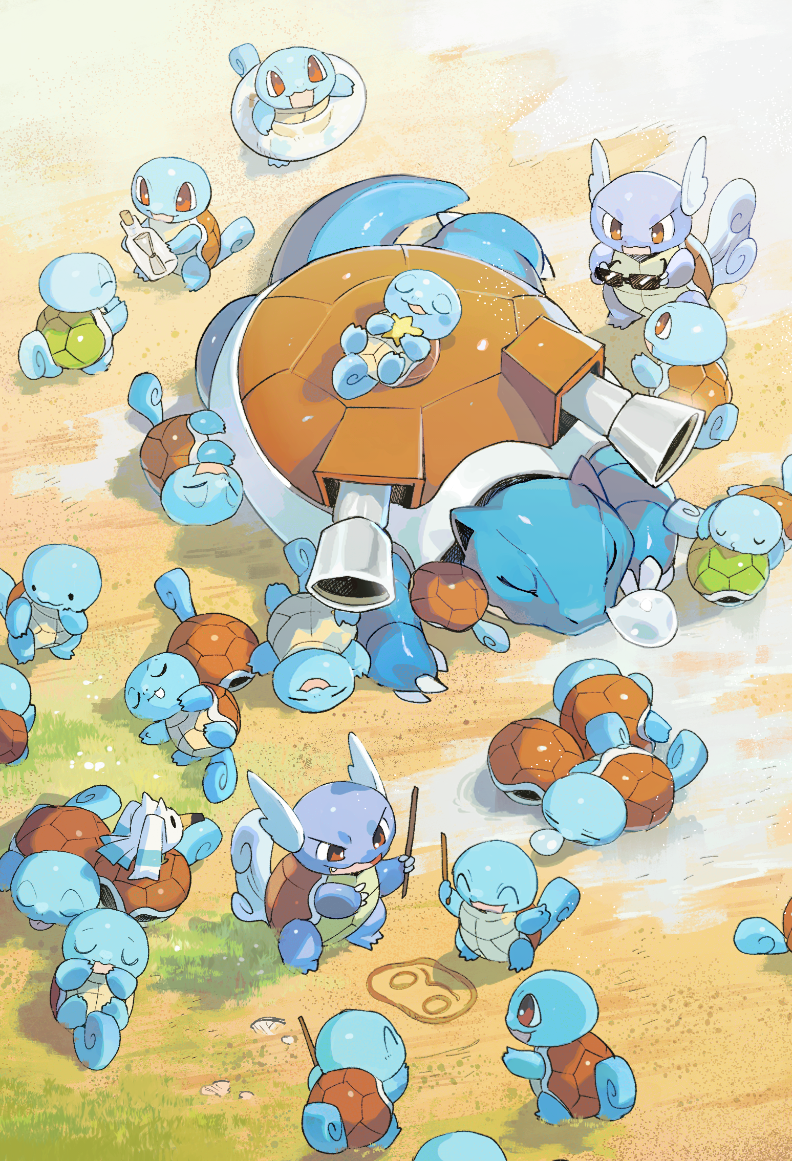 alternate_color beach blastoise blue_skin bottle brown_eyes colored_skin commentary_request ditto evolutionary_line fangs from_above gen_1_pokemon gen_3_pokemon glass_bottle highres holding holding_bottle innertube newo_(shinra-p) nintendo nose_bubble pokemon pokemon_(creature) puddle sand shell shiny_and_normal shiny_pokemon shoulder_cannon sleeping squirtle stick sunglasses swim_ring tail transformed_ditto wartortle water wingull