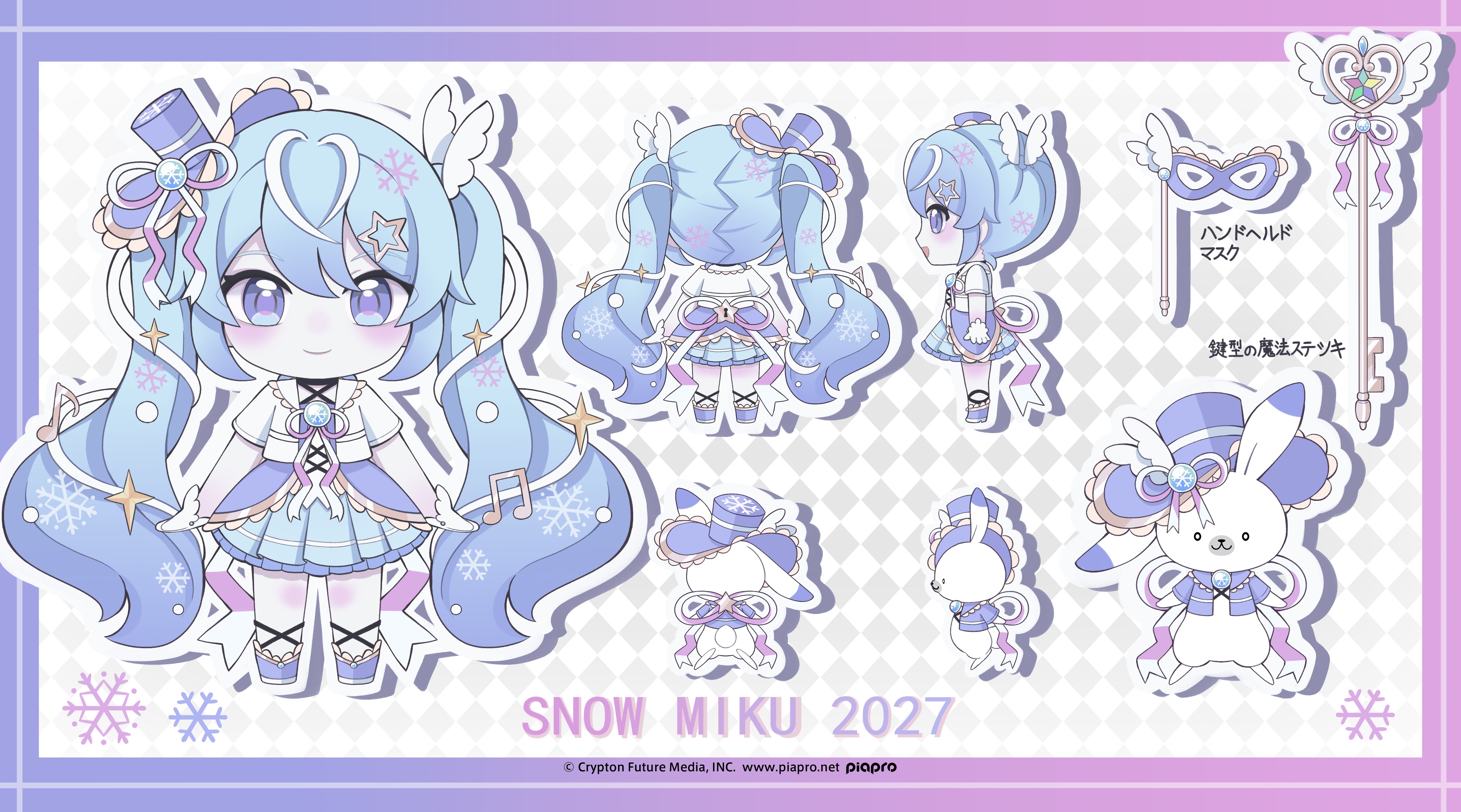 absurdres back_ribbon blue_hair blue_skirt chibi closed_mouth commentary_request company_name copyright_name copyright_notice dress eye_mask fortissimo full_body hair_ornament hat hatsune_miku heart_wand highres huise_shuying long_hair looking_at_viewer mask multicolored_hair multiple_views musical_note musical_note_hair_ornament open_clothes open_vest outline pleated_skirt purple_dress purple_eyes purple_hat purple_ribbon purple_shoes rabbit_yukine reference_sheet ribbon shoes skirt smile snowflake_hair_ornament star_(symbol) star_hair_ornament streaked_hair too_many_hair_ornaments twintails two-tone_ribbon very_long_hair vest vocaloid white_outline white_ribbon white_streaks white_vest wing_hair_ornament yuki_miku yuki_miku_(2027)_(applicant)