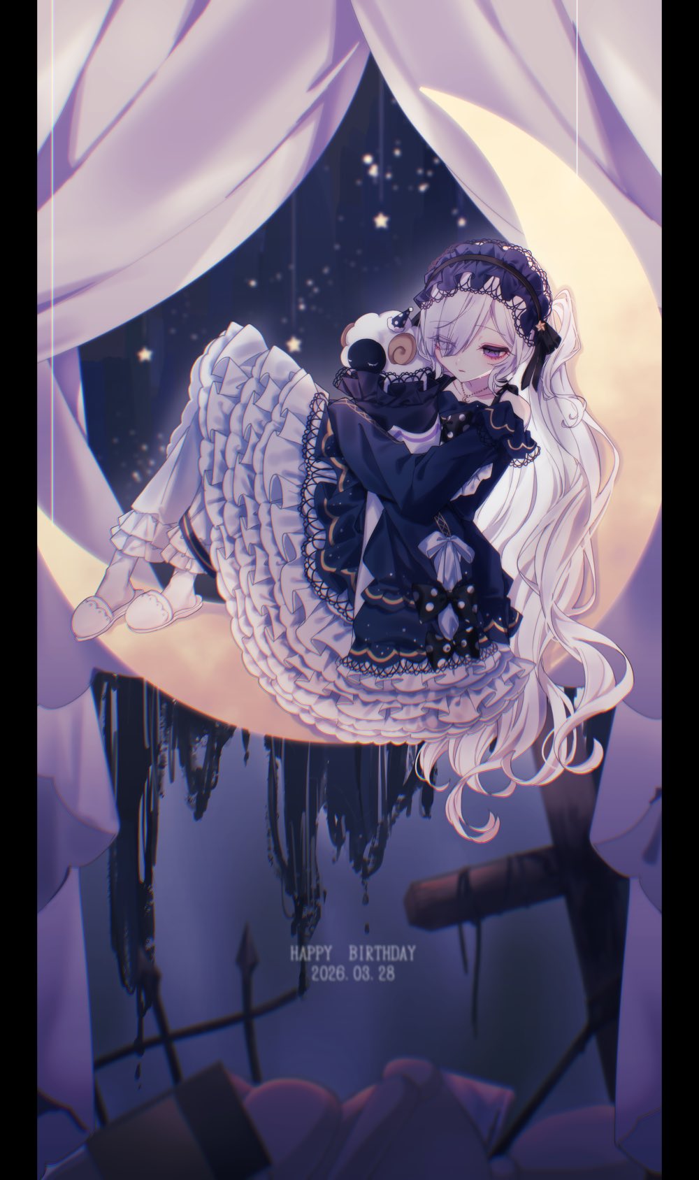 1girl blue_dress blue_hairband bow commentary_request cross curtains dated dress frilled_dress frills full_body gothic_lolita hair_over_one_eye hairband happy_birthday highres holding holding_pillow knees_up lolita_fashion lolita_hairband long_hair long_sleeves mahou_shoujo_no_majo_saiban natsume_an-an on_crescent pillow polka_dot polka_dot_bow purple_eyes sitting sleeves_past_fingers sleeves_past_wrists solo spoilers un_(prmc_aaa) very_long_hair white_hair