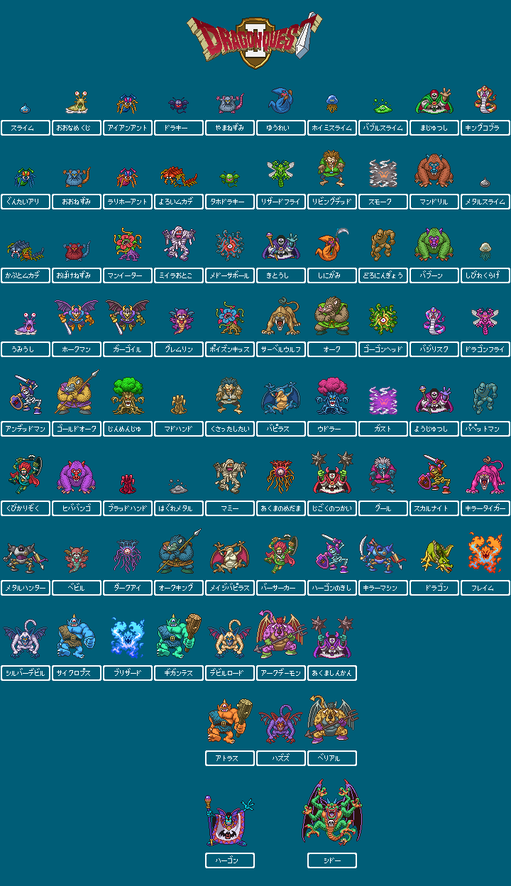 archdemon_(dragon_quest) army_ant_(dragon_quest) atlas_(dragon_quest) badboon batmandrill belial_(dragon_quest) berserker_(dragon_quest) big_badboon bloody_hand_(dragon_quest) blue_background brainy_badboon bubble_slime character_request chasmonaut check_character chewlip cobra_kaiser cobra_king commentary_request copyright_name corpse_corporal cyclops cyclops_(dragon_quest) dancing_flame deadnaut_(dragon_quest) dirty_rat_(dragon_quest) drackmage dracky dragon dragon_quest dragon_quest_ii dragonfly_(dragon_quest) dragonfry eyelasher fat_rat_(dragon_quest) frostburn_(dragon_quest) gargoyle_(dragon_quest) ghoul_(dragon_quest) gigantes_(dragon_quest) gnashturtium goregon green_dragon_(dragon_quest) gremlin_(dragon_quest) grimlin hargon hargonaut hawk_man_(dragon_quest) headhunter_(dragon_quest) healslime heyedra highres holding holding_polearm holding_scythe holding_staff holding_sword holding_weapon hunter_mech iron_ant_(dragon_quest) killing_machine_(dragon_quest) killipede liquid_metal_slime_(dq) madusa_(dragon_quest) magic_marionette_(dragon_quest) magus_(dragon_quest) malroth man_o'_war_(dragon_quest) maulusc mean_spirit merlusc metal_slime miasma_(dragon_quest) monster mud_mannequin muddy_hand mummy mummy_(dragon_quest) mummy_boy one-eyed open_mouth orc_(dragon_quest) orc_chieftain_(dragon_quest) orc_king_(dragon_quest) pixel_art polearm quiver ratscal sabrecat scythe sentripede shaman_(dragon_quest) silvapithecus slime_(creature) slime_(dragon_quest) slug smog_(dragon_quest) snake somnol_ant sorcerer_(dragon_quest) spirit_(dragon_quest) staff striking_sabrecat sword terrordactyl tongue tongue_out translation_request treeface treevil tyrannodactyl vyzf2743 walking_corpse_(dragon_quest) weapon whackolyte white_hair wrecktor