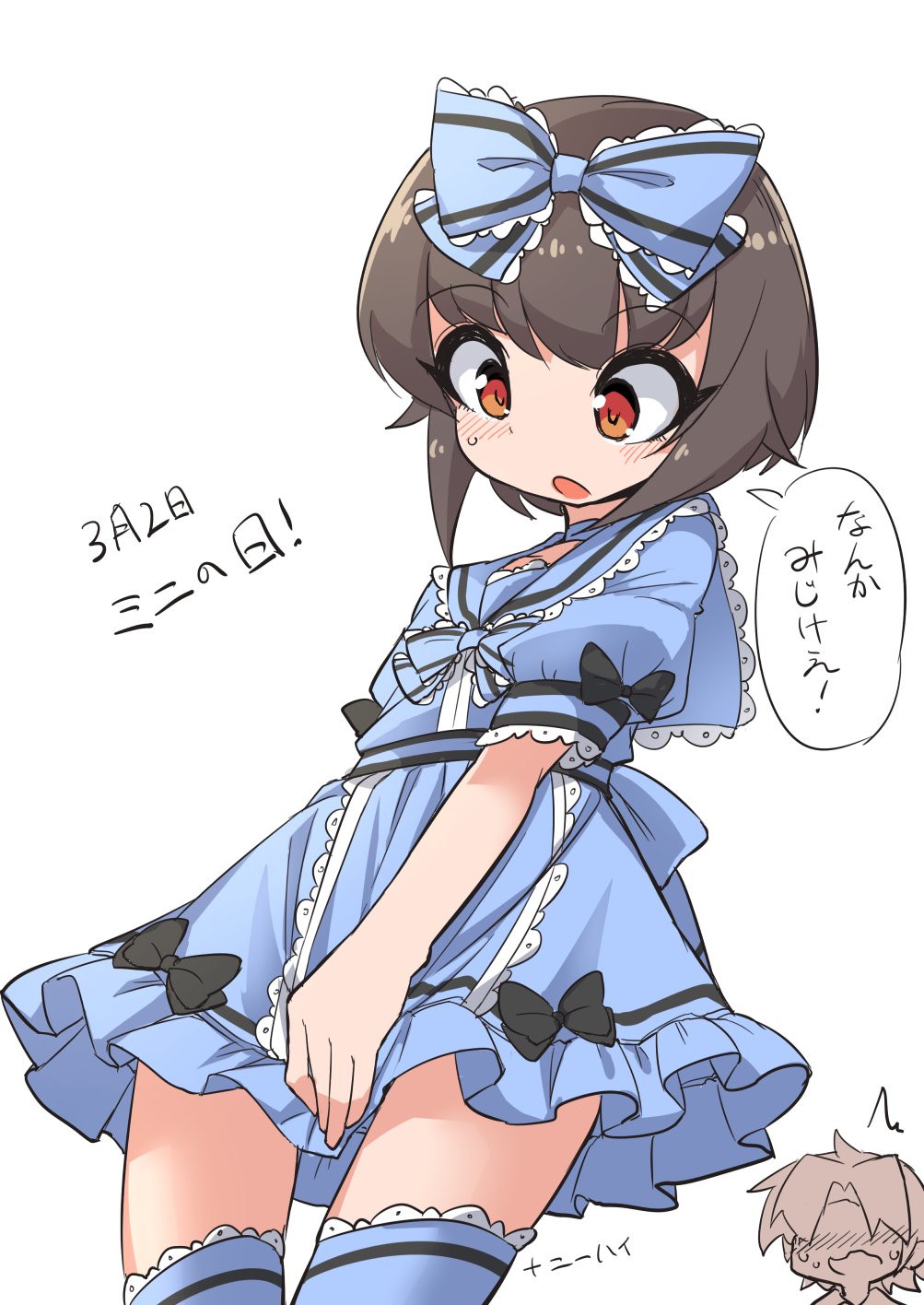 2boys alternate_skirt_length ayumu_(fun_bo) back_ribbon black_bow blue_bow blue_bowtie blue_choker blue_dress blue_sailor_collar blue_socks blush bow bowtie brown_hair choker commentary_request crossdressing crossdressing_(mtf) dress dress_bow frilled_bow frilled_dress frilled_sailor_collar frilled_socks frills fun_bo hair_bow highres large_bow looking_down male_focus miniskirt multiple_boys open_mouth original puffy_short_sleeves puffy_sleeves red_eyes sailor_collar short_hair short_sleeves simple_background skirt skirt_tug sleeve_bow socks solo_focus speech_bubble standing sweatdrop thighhighs white_background