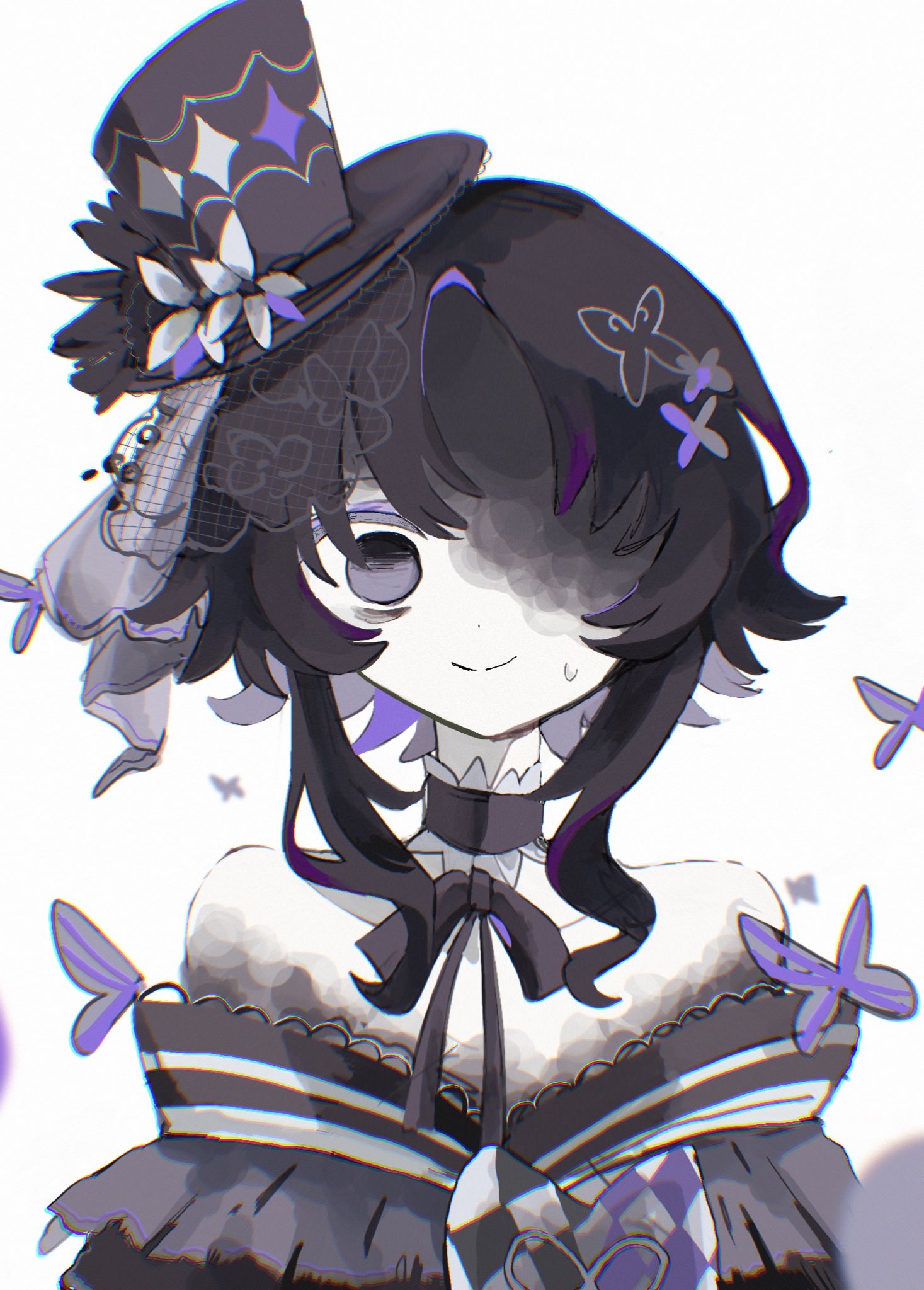 1girl aaa6n6 bare_shoulders black_choker black_hair black_hat black_ribbon bug butterfly choker chromatic_aberration closed_mouth commentary_request frilled_choker frills hat highres housho_margo insect japanese_clothes lolita_fashion looking_at_viewer mahou_shoujo_no_majo_saiban neck_ribbon one_eye_covered parted_bangs purple_butterfly purple_eyes ribbon smile solo spoilers sweatdrop top_hat upper_body wa_lolita white_background witch_(manosaba)