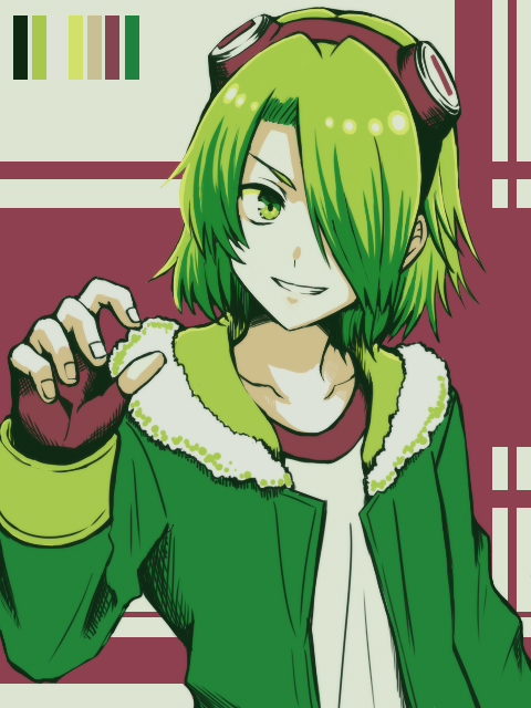 1boy akame_ga_kill! collarbone color_guide commentary_request fingerless_gloves fingernails gloves goggles goggles_on_head green_hair green_jacket grin hair_over_one_eye jacket koroni_(nkrgs) looking_at_viewer lubbock male_focus shirt short_hair smile solo upper_body white_shirt