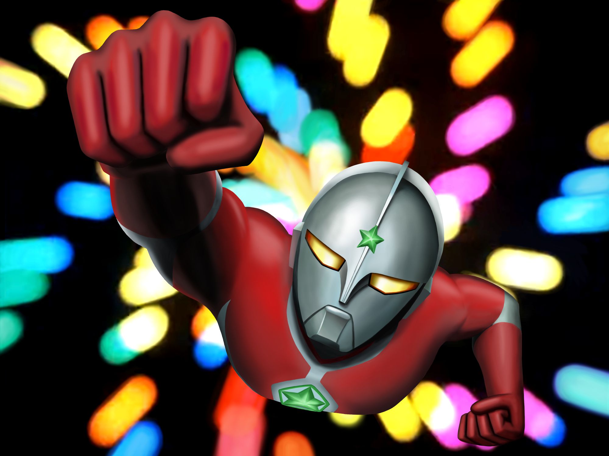 1boy alien arm_up black_background clenched_hands color_timer colored_skin colorful_background commentary dorsal_fin forehead_jewel from_above gem giant giant_male glowing glowing_eyes green_gem green_star gun_gun_cut henshin highres looking_at_viewer looking_up male_focus multicolored_skin no_pupils orihu278 pectorals raised_fist red_skin silver_skin solo star_(symbol) the_ultraman_(anime) tokusatsu toned toned_male two-tone_skin ultra_series ultraman_joneus yellow_eyes