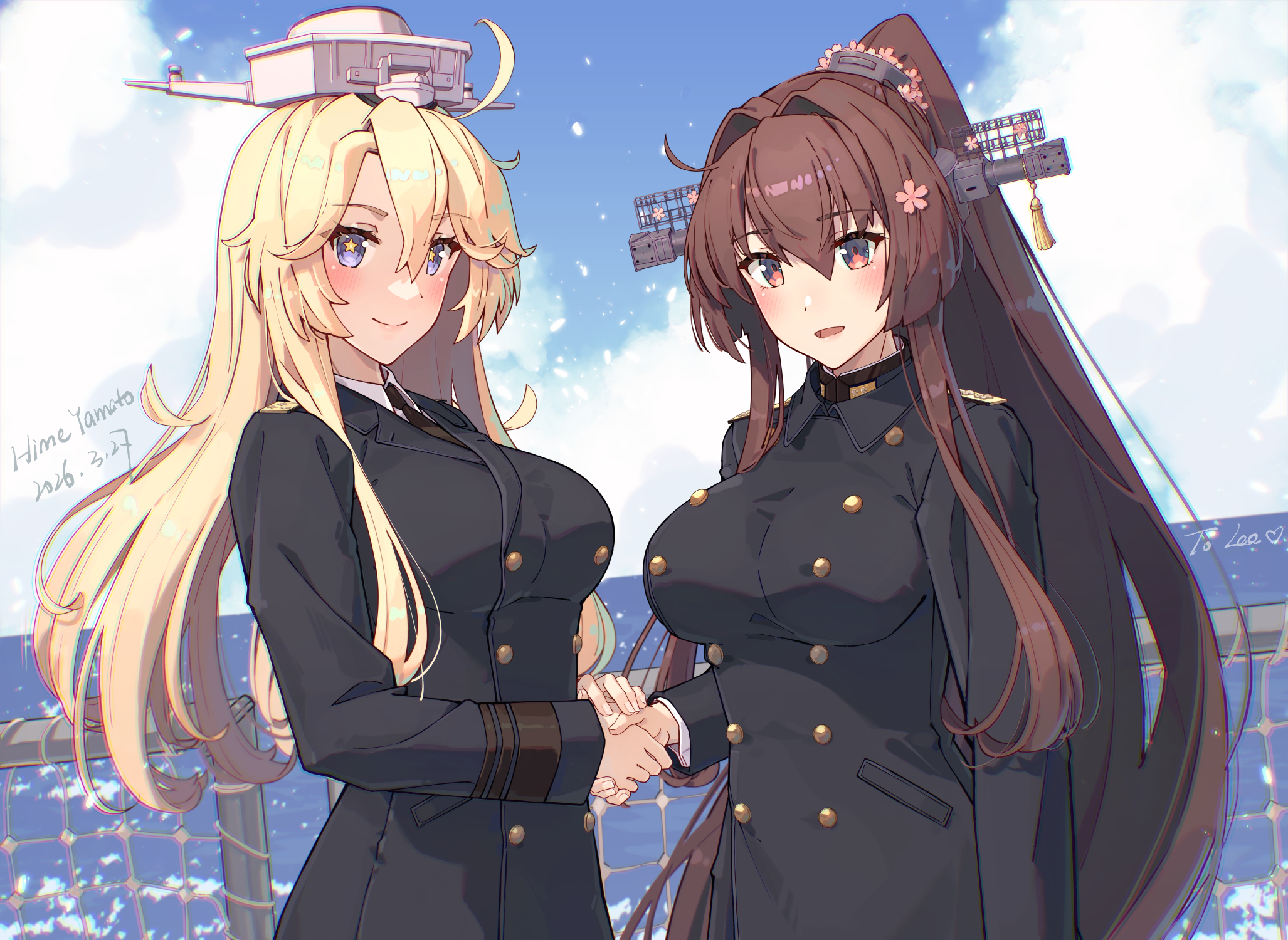 2girls black_coat blonde_hair blue_eyes blue_sky breasts brown_hair cherry_blossoms cloud coat commentary_request day epaulettes flower hair_between_eyes hair_flower hair_intakes hair_ornament handshake headgear highres himeyamato iowa_(kancolle) kantai_collection large_breasts long_hair long_sleeves military_uniform multiple_girls naval_dress_uniform naval_uniform outdoors ponytail red_eyes sidelocks sky smile star-shaped_pupils star_(symbol) symbol-shaped_pupils very_long_hair yamato_(kancolle)