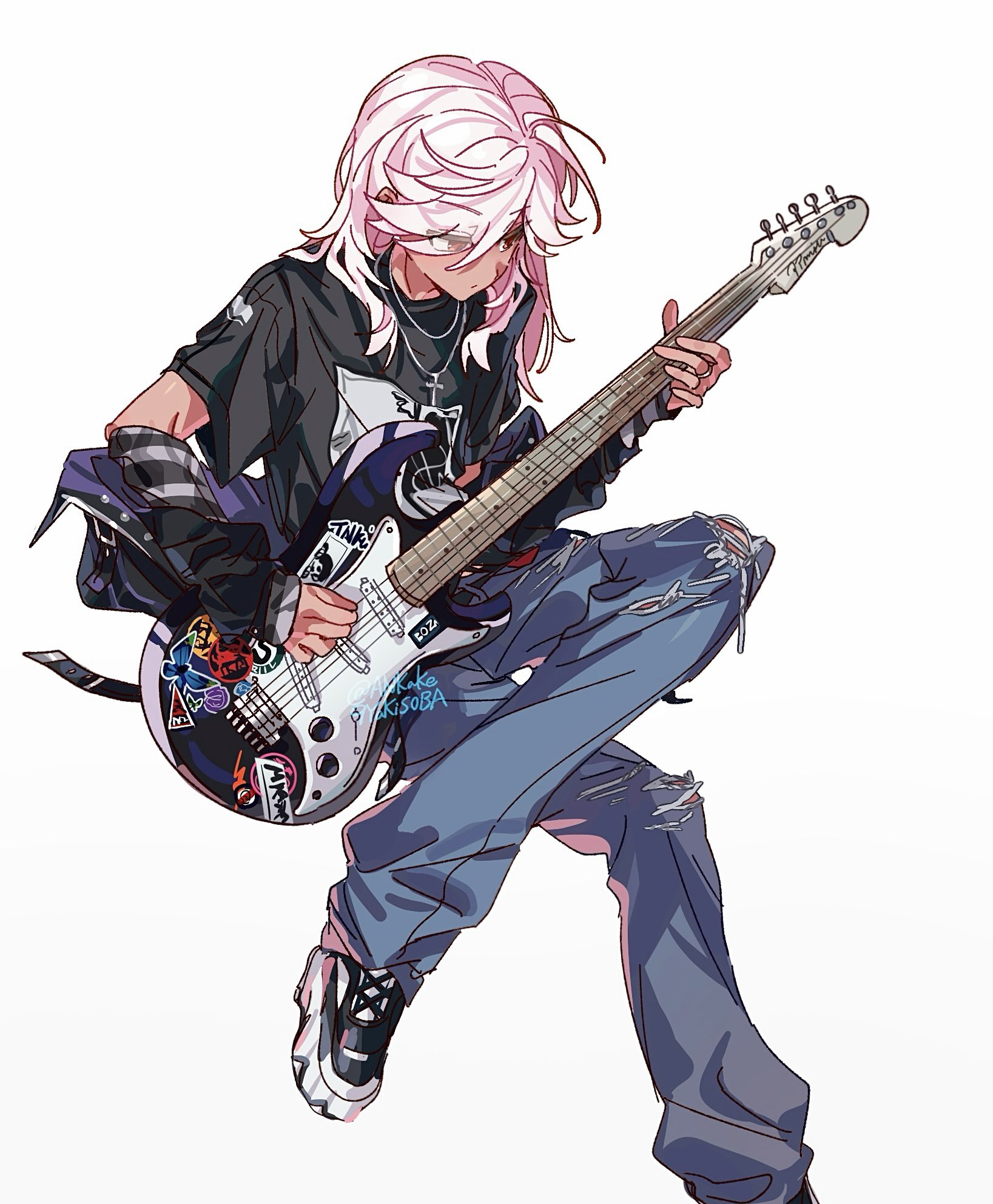 1boy alternate_costume ankake9yakisoba arm_warmers black_jacket black_shirt closed_mouth commentary cross cross_necklace cyno_(genshin_impact) dark-skinned_male dark_skin denim electric_guitar genshin_impact guitar hair_over_one_eye highres holding holding_instrument instrument invisible_chair jacket jeans jewelry long_hair male_focus necklace off_shoulder open_clothes open_jacket pants red_eyes ring shirt shoes simple_background sitting sneakers solo striped_arm_warmers torn_clothes torn_jeans torn_pants untranslatable_commentary white_background white_hair