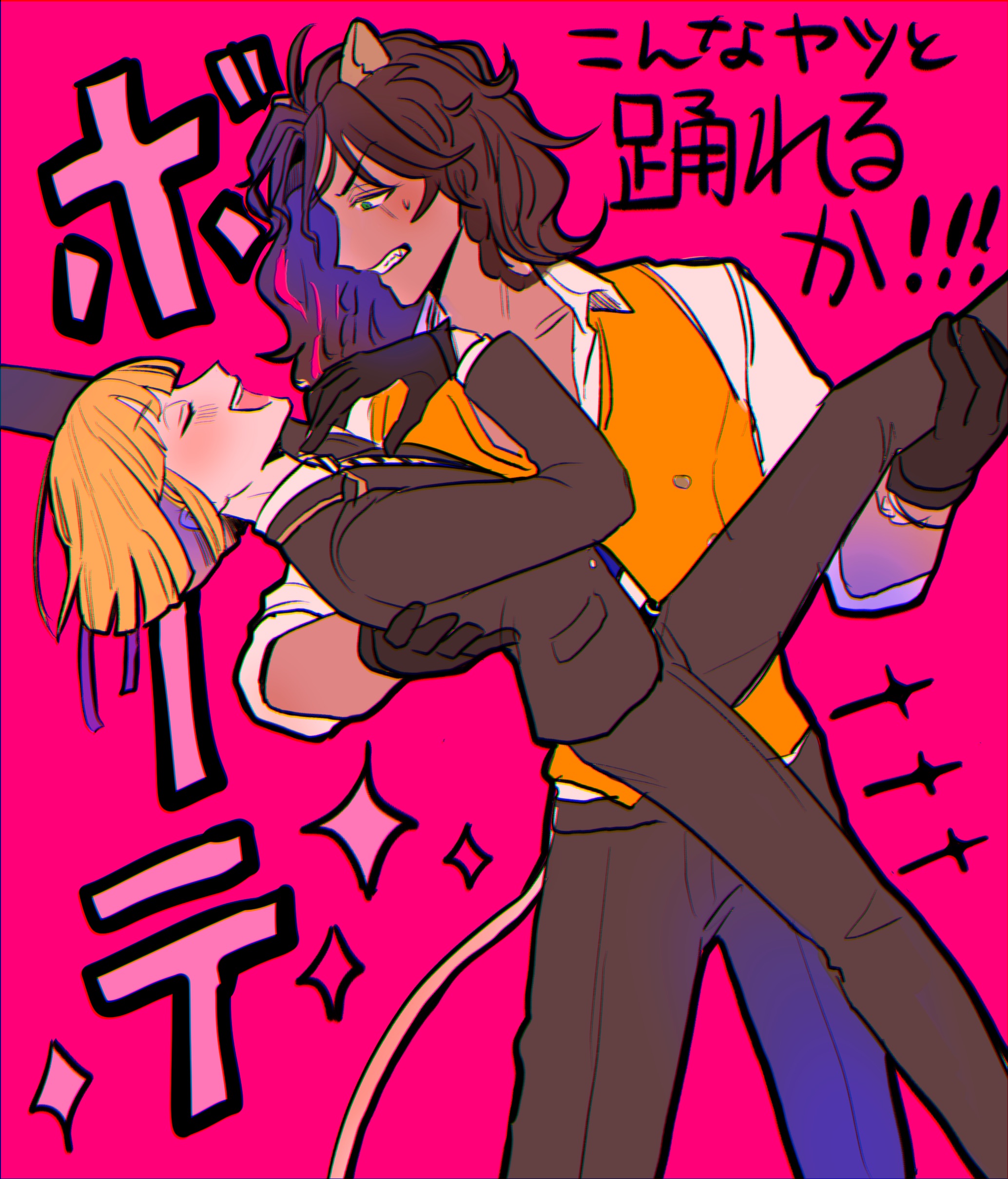 2boys absurdres animal_ears black_gloves blonde_hair bob_cut braid brown_hair colored_skin commentary_request dark-skinned_male dark_skin gloves green_eyes highres leona_kingscholar lion_boy lion_ears long_hair male_focus multiple_boys pink_background poposeibo rook_hunt school_uniform short_hair twin_braids twisted_wonderland white_skin yaoi