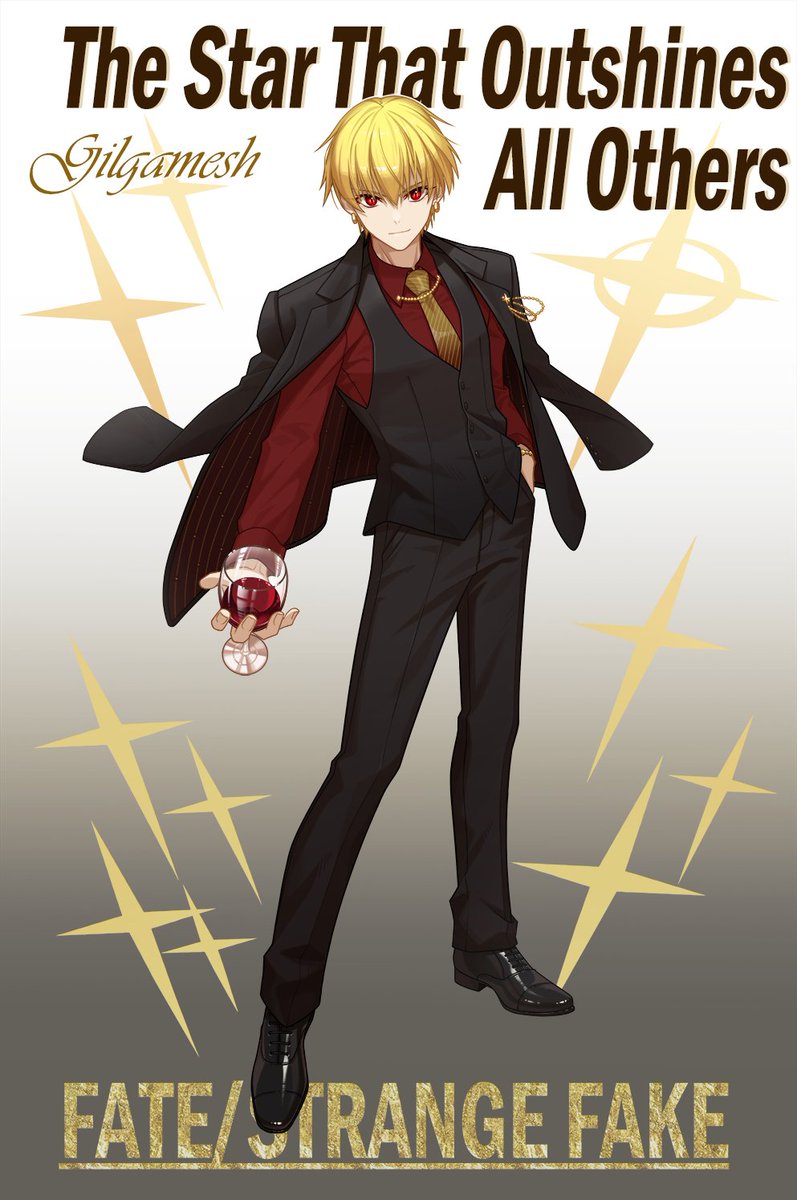 1boy black_pants black_shoes black_vest blonde_hair buttons character_name closed_mouth collared_shirt commentary_request copyright_name cross_akiha cup drinking_glass earrings english_text fate/strange_fake fate_(series) gilgamesh_(fate) gold_earrings gradient_background hand_in_pocket highres holding holding_cup jacket jacket_on_shoulders jewelry lapels layered_clothes long_sleeves looking_at_viewer male_focus necktie notched_lapels pants red_eyes red_shirt shirt shoes smile solo sparkle standing vest wine_glass wing_collar