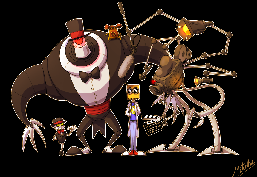 3boys arms_behind_back artist_name bag_on_head black_background black_jacket black_pants blue_pants camera commentary_request dr._flug full_body goggles hatbot-ler_(villainous) hatbot-sentinel_(villainous) jacket lab_coat machine male_focus multiple_boys nyatarou pants red_eyes red_shoes robot shoes simple_background standing villainous yellow_eyes