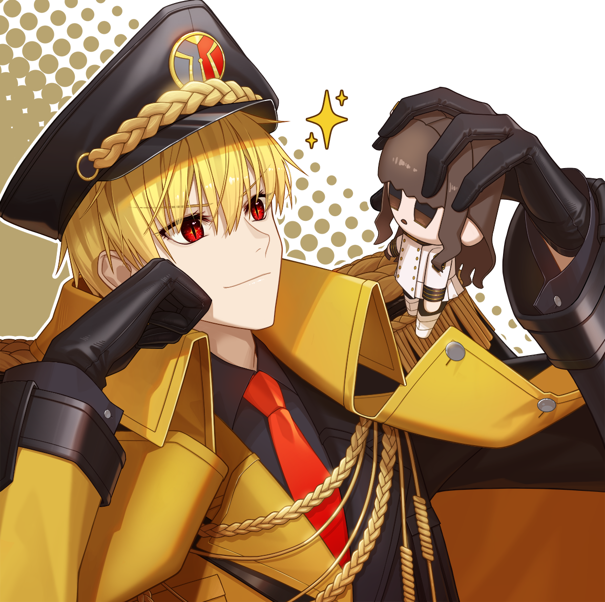 1boy arm_support black_gloves blonde_hair brown_eyes brown_hair buttons character_doll clenched_hand closed_mouth collared_shirt commentary_request cross_akiha doll double-breasted fate/extra fate/extra_ccc fate_(series) gilgamesh_(fate) gilgamesh_(wada_arco_exhibition)_(fate) gloves hand_on_own_face hands_up hat holding holding_stuffed_toy kishinami_hakuno_(female) long_hair long_sleeves male_focus military_uniform necktie outline red_eyes red_necktie shirt short_hair smile solo sparkle stuffed_animal stuffed_toy upper_body white_outline