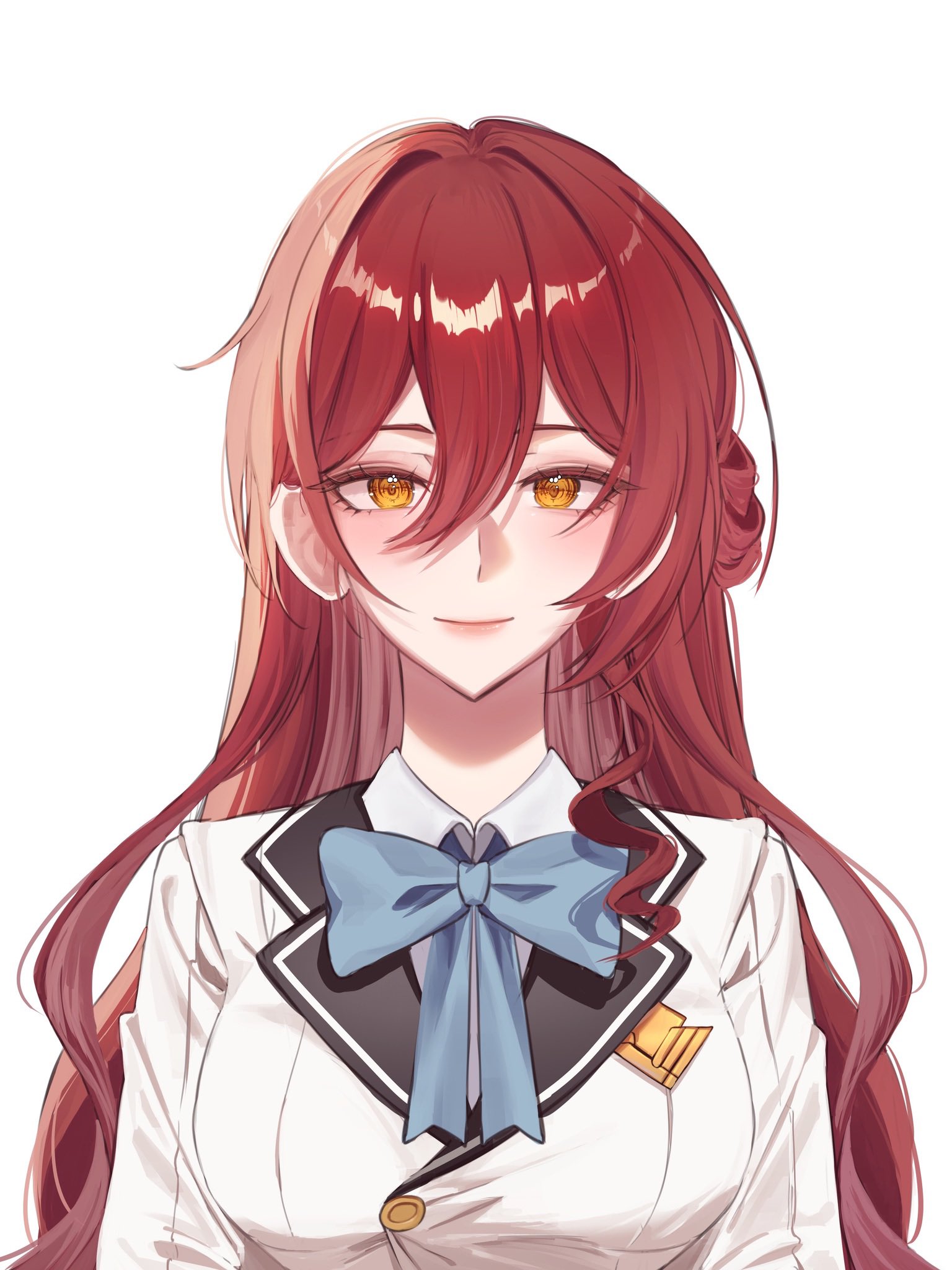 1girl blue_bow blue_bowtie bow bowtie breasts commentary highres himeko_(honkai:_star_rail) honkai:_star_rail honkai_(series) large_breasts long_hair looking_at_viewer o_yuuuuu5 orange_eyes red_hair school_uniform serafuku simple_background smile solo very_long_hair white_background white_serafuku