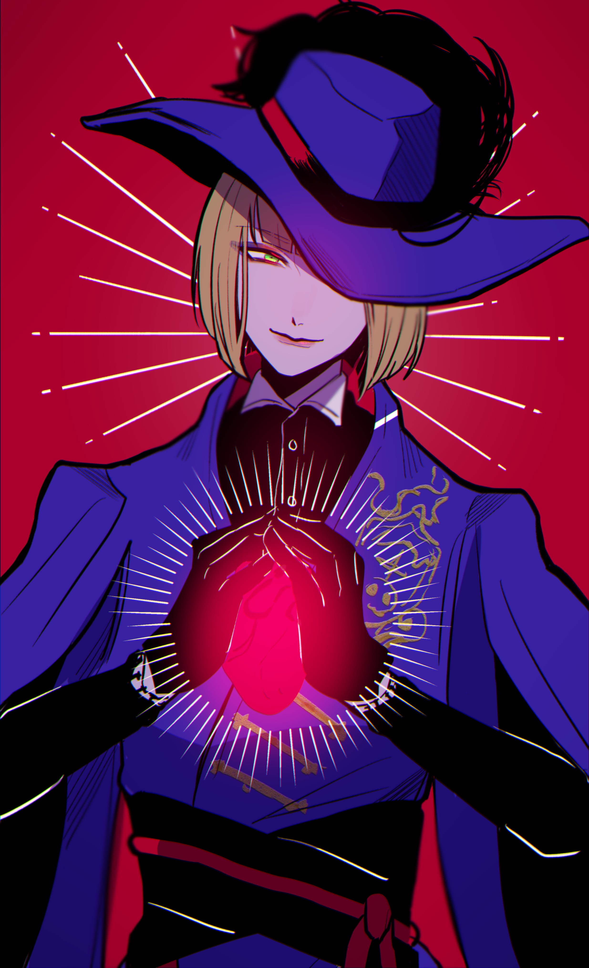 1boy absurdres blonde_hair bob_cut commentary_request green_eyes hat heart_(organ) highres looking_at_viewer male_focus poposeibo red_background rook_hunt solo twisted_wonderland