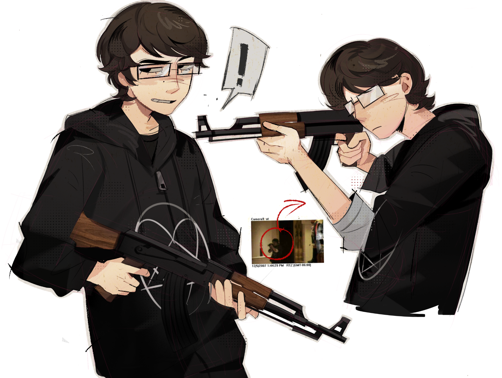 ! 1boy 2007 aiming animification black-framed_eyewear black_eyes black_jacket black_pants black_shirt blush_stickers brown_hair closed_mouth collarbone cowboy_shot cropped_torso curly_hair dated empty_eyes finger_on_trigger frown glasses goodfolk2 grin gun halftone hands_up head_tilt highres holding holding_gun holding_weapon hood hood_down hooded_jacket jacket jitome long_sleeves looking_ahead looking_at_viewer male_focus meme mole mole_under_eye multiple_views no_pupils opaque_glasses pants photo_inset puffy_long_sleeves puffy_sleeves raised_eyebrow real_life red_arrow_and_circle_(meme) reference_inset robert_hawkins shirt short_hair sideways_glance simple_background smile spoken_exclamation_mark standing swept_bangs thick_eyebrows three-quarter_sleeves true_crime very_short_hair weapon westroads_mall_shooting white_background zipper zipper_pull_tab