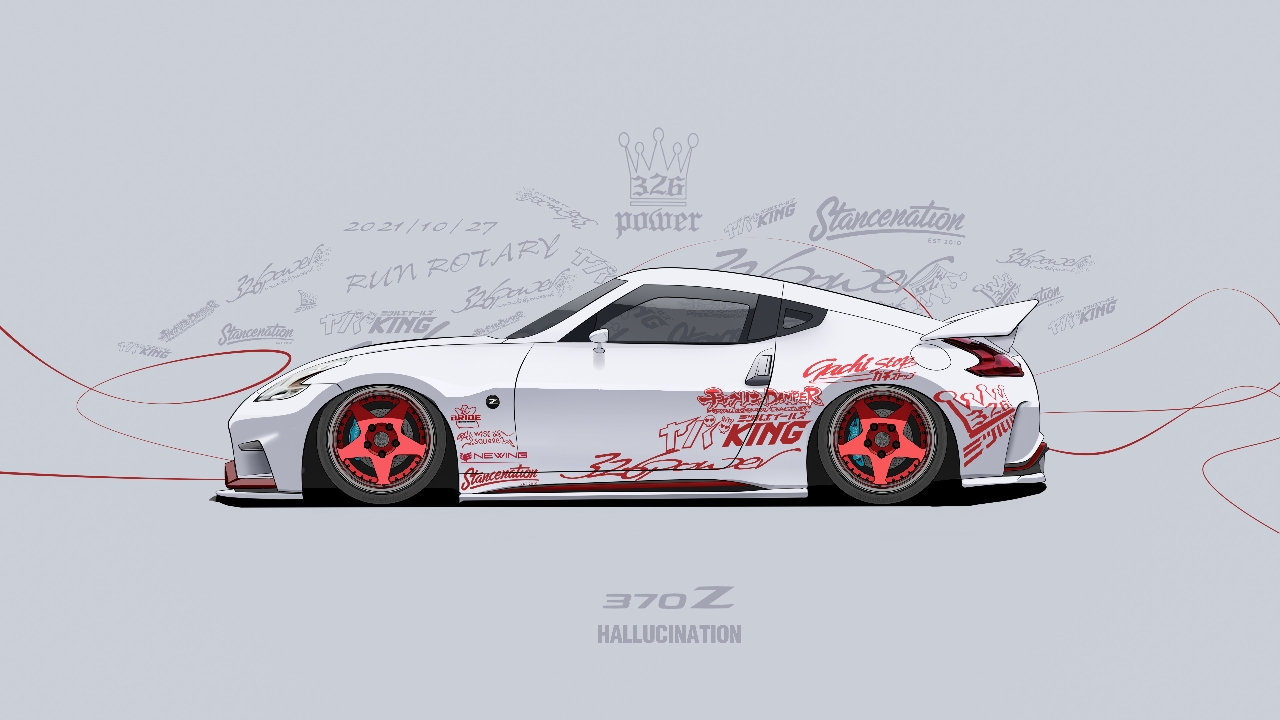 artist_name car english_text from_side grey_background motor_vehicle nissan nissan_370z nissan_fairlady_z no_humans run_rotary simple_background spoiler_(automobile) sports_car vehicle_focus