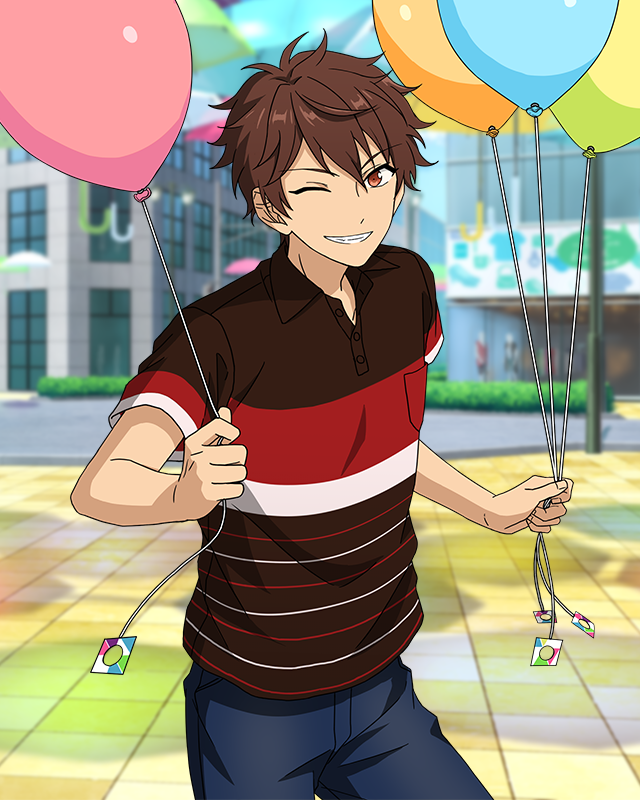 1boy balloon breast_pocket brown_hair bush clenched_teeth collared_shirt cowboy_shot ensemble_stars! fingernails game_cg hair_between_eyes happy_elements holding holding_balloon looking_at_viewer male_focus morisawa_chiaki official_art one_eye_closed open_collar outdoors pocket polo_shirt red_eyes shirt short_hair short_sleeves smile solo sunshower_festa_(ensemble_stars!) teeth third-party_source umbrella window