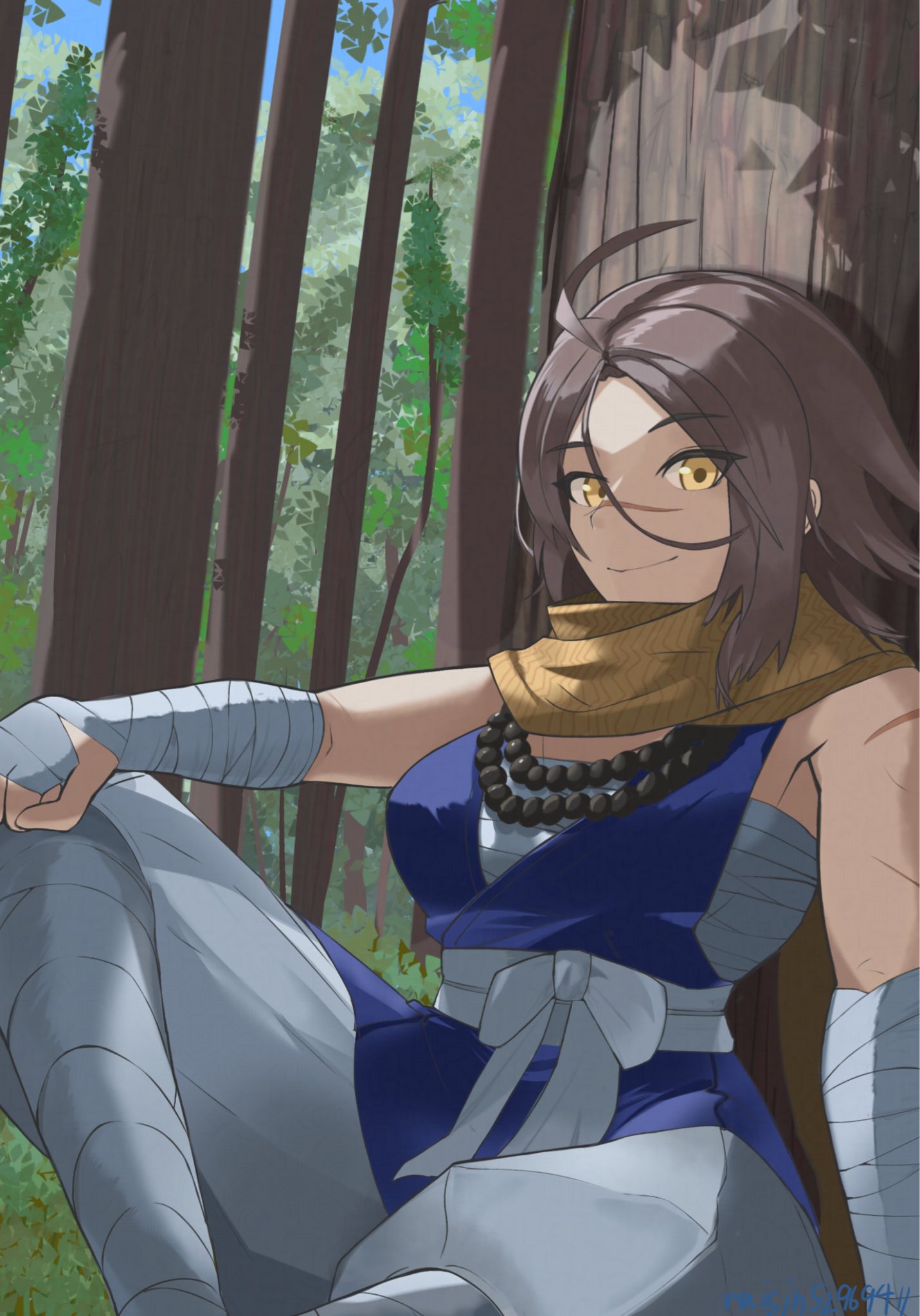 1girl ahoge bandaged_arm bandages bare_shoulders bead_necklace beads breasts brown_eyes brown_hair chest_sarashi fate/grand_order fate_(series) forest highres jewelry large_breasts nature necklace prayer_beads raisin52969411 sarashi scar scar_on_arm scar_on_face scar_on_nose scarf short_hair sitting smile sugitani_zenjubou_(fate) sugitani_zenjubou_(first_ascension)_(fate) yellow_scarf