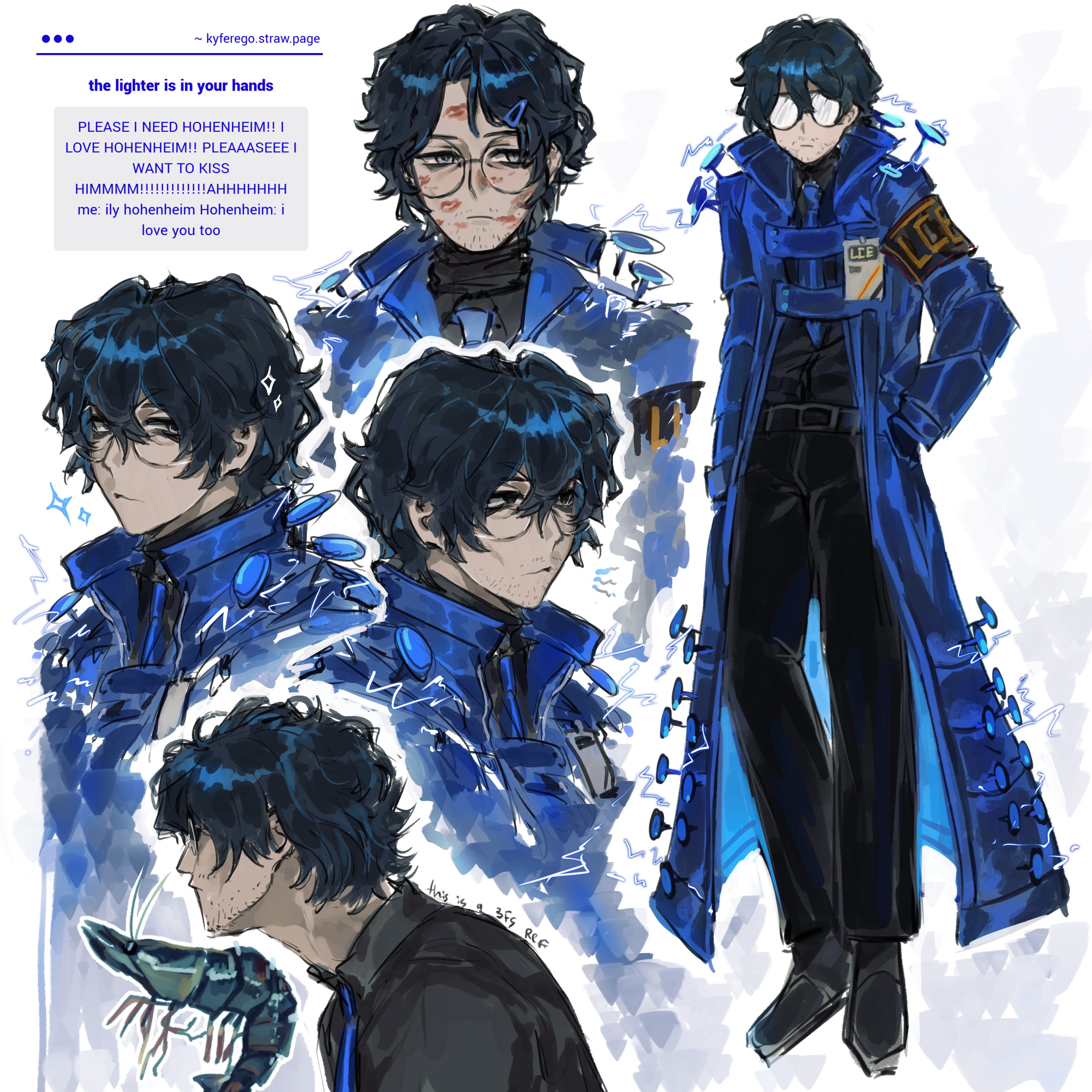 1boy absurdres aedd_(e.g.o) armband black_armband black_hair black_pants black_shirt blue_coat blue_necktie coat e.g.o_(project_moon) electricity fan_request glasses highres hohenheim_(project_moon) hunched_over id_card kefir1704 limbus_company lipstick_mark lipstick_mark_on_face multiple_views necktie pants project_moon request_inset round_eyewear shirt simple_background slouching sparkle strawpage white_background
