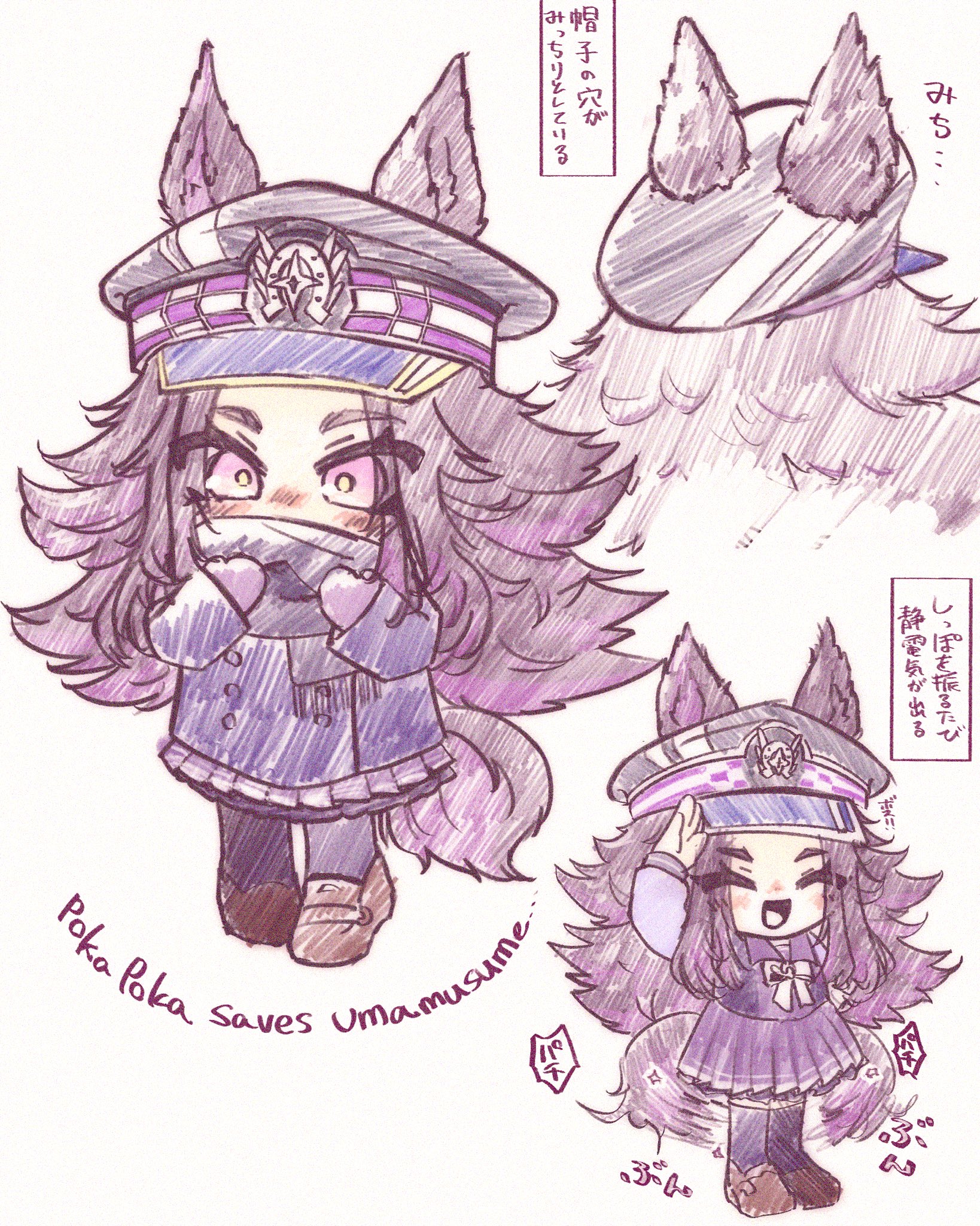 1girl animal_ears black_hair blush chibi ears_through_headwear fenomeno_(umamusume) flipped_hair hat highres horse_ears horse_girl horse_tail horseshoe_hat_ornament horseshoe_ornament long_hair long_sleeves looking_at_viewer multicolored_hair open_mouth peaked_cap purple_eyes purple_hair purple_sailor_collar purple_serafuku purple_shirt sailor_collar sailor_shirt school_uniform serafuku shirt smile tail tracen_school_uniform umamusume und0-