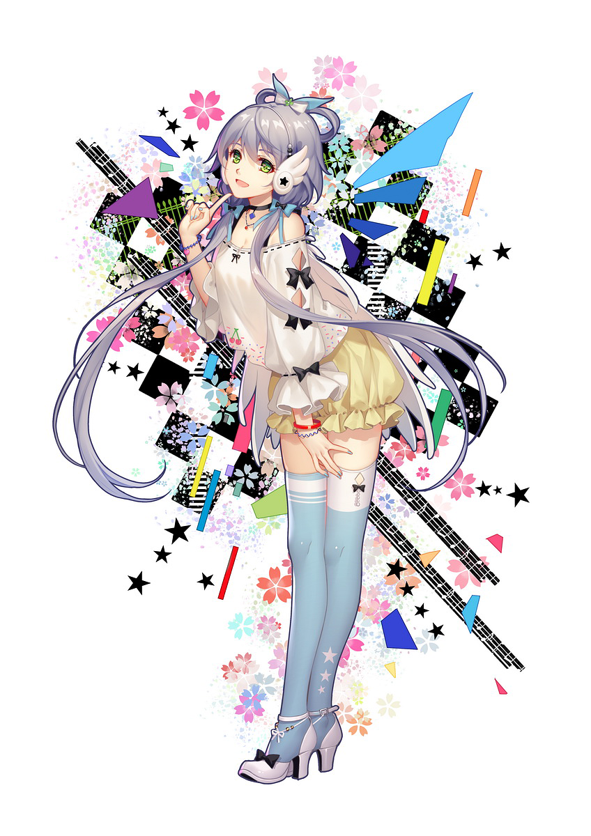 1girl asymmetrical_legwear bare_shoulders blue_socks bow feixianji_(hairstyle) full_body green_eyes grey_hair hair_bow hair_ornament hair_rings headphones high_heels highres long_hair looking_at_viewer low_twintails luo_tianyi luo_tianyi_(vocaloid4)_(japanese) multiple_hair_bows off_shoulder official_art open_mouth shirt shoes short_hair_with_long_locks shorts smile socks solo thighhighs tidsean twintails vocaloid vsinger_(vocaloid) white_shirt white_shoes yellow_shorts