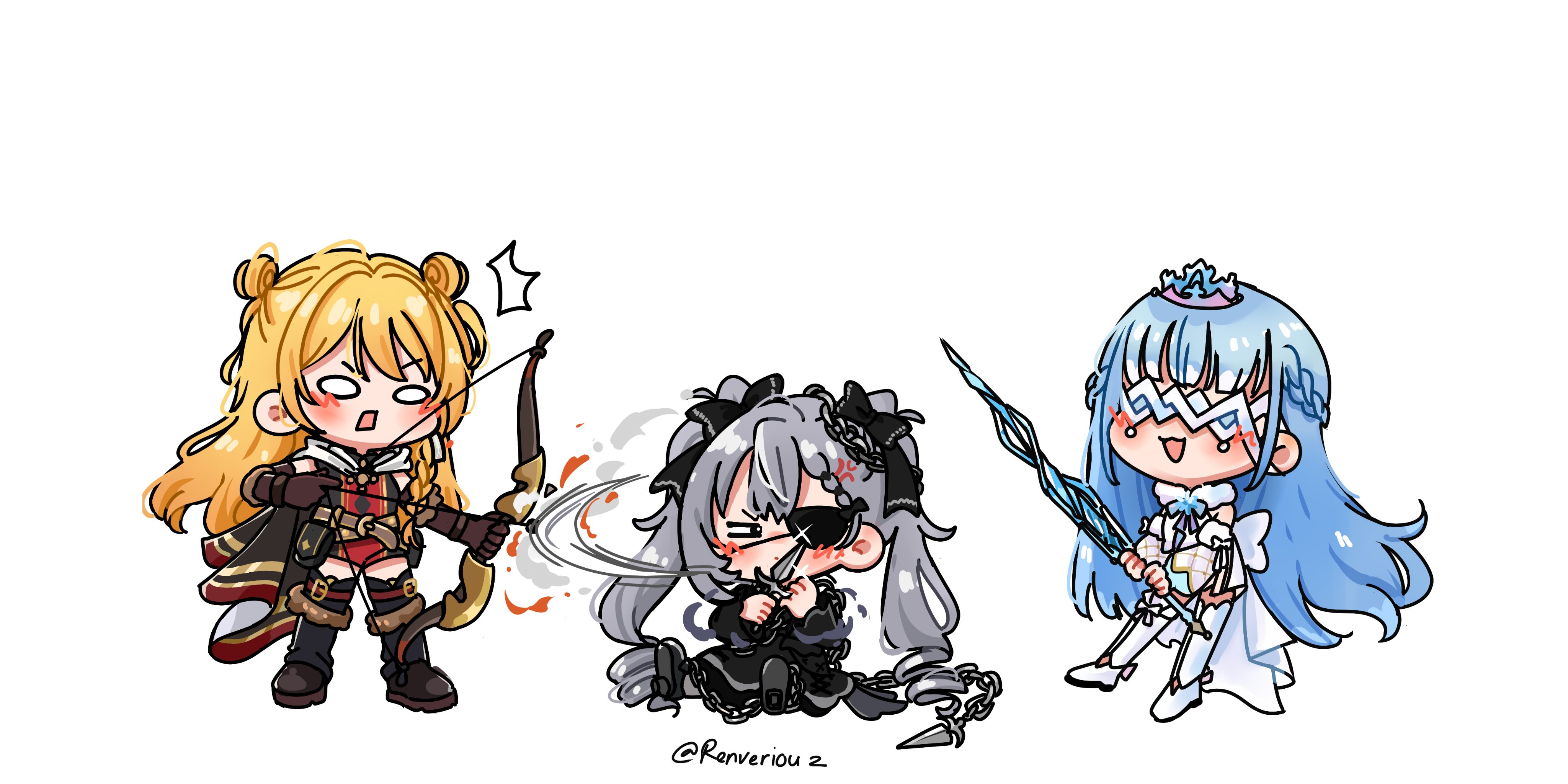 3girls absurdres blonde_hair blue_hair bow_(weapon) chibi commentary dagger double_bun english_commentary eye_mask grey_hair hair_bun highres hololive hololive_indonesia kaela_kovalskia kaela_kovalskia_(5th_costume) knife kobo_kanaeru kobo_kanaeru_(5th_costume) mask multiple_girls renveriouz sword twintails vestia_zeta vestia_zeta_(5th_costume) virtual_youtuber weapon