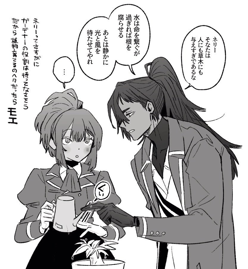 ... 1boy 1girl ascot aseah_(project_moon) blush buttons coat collared_shirt commentary gloves greyscale high_ponytail holding holding_watering_can lapels limbus_company long_sleeves monochrome nelly_(project_moon) notched_lapels open_mouth plant ponytail potted_plant project_moon shirt sidelocks simple_background speech_bubble tama_launcher translation_request undershirt watering_can