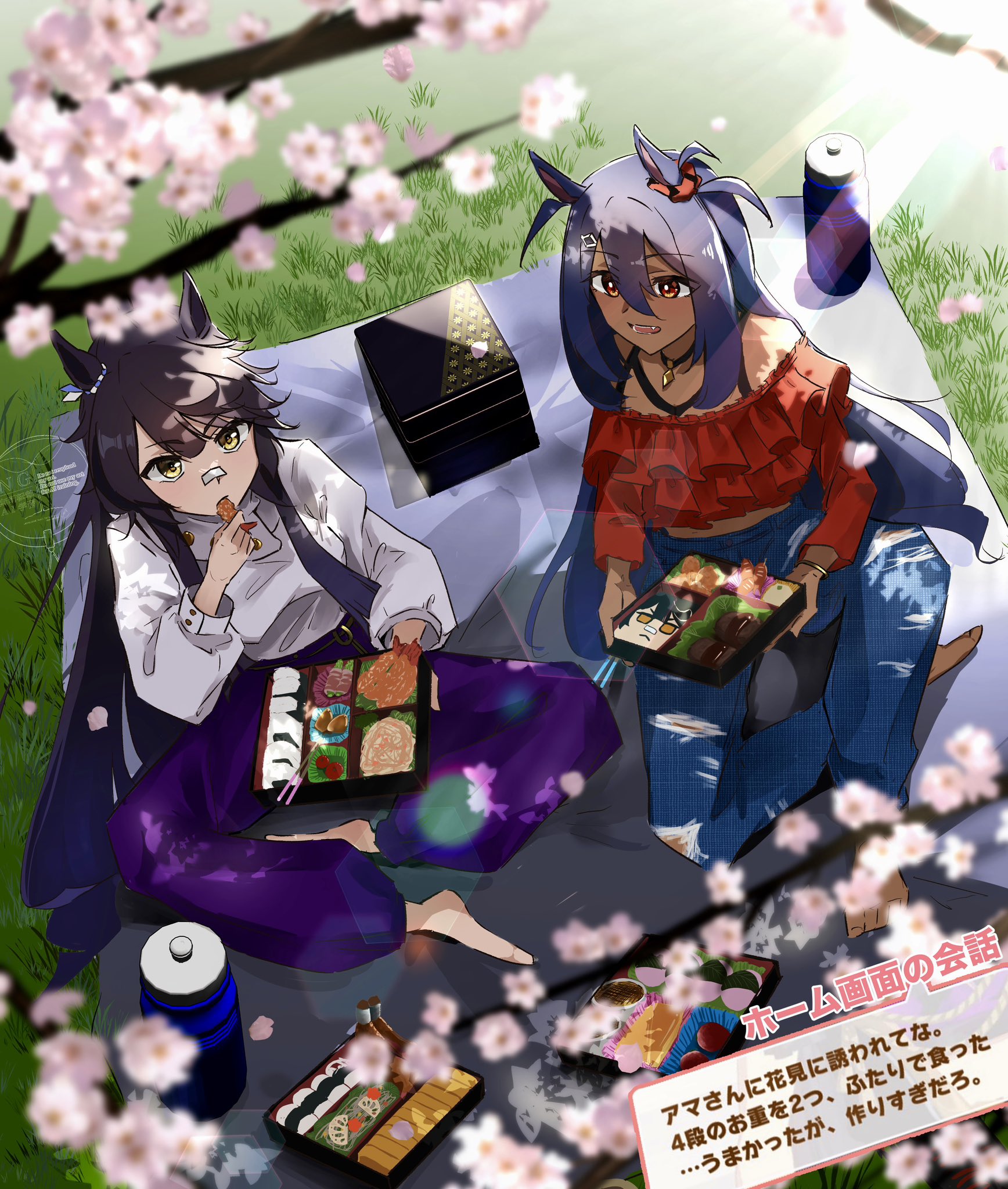 2girls animal_ears bandaid bandaid_on_face bandaid_on_nose bento black_hair breasts casual cherry_blossoms dark-skinned_female dark_skin day denim ear_scrunchie eating food grass hair_between_eyes hair_ornament hairclip hanami highres hishi_amazon_(casual)_(umamusume) hishi_amazon_(umamusume) holding holding_food horse_ears horse_girl horse_tail jeans long_hair long_sleeves multiple_girls naegi_happy narita_brian_(casual)_(umamusume) narita_brian_(umamusume) off-shoulder_shirt off_shoulder onigiri open_mouth outdoors pants picnic picnic_blanket ponytail purple_pants red_eyes red_shirt shirt sitting smile sweater tail thermos torn_clothes torn_jeans torn_pants umamusume very_long_hair white_sweater yellow_eyes