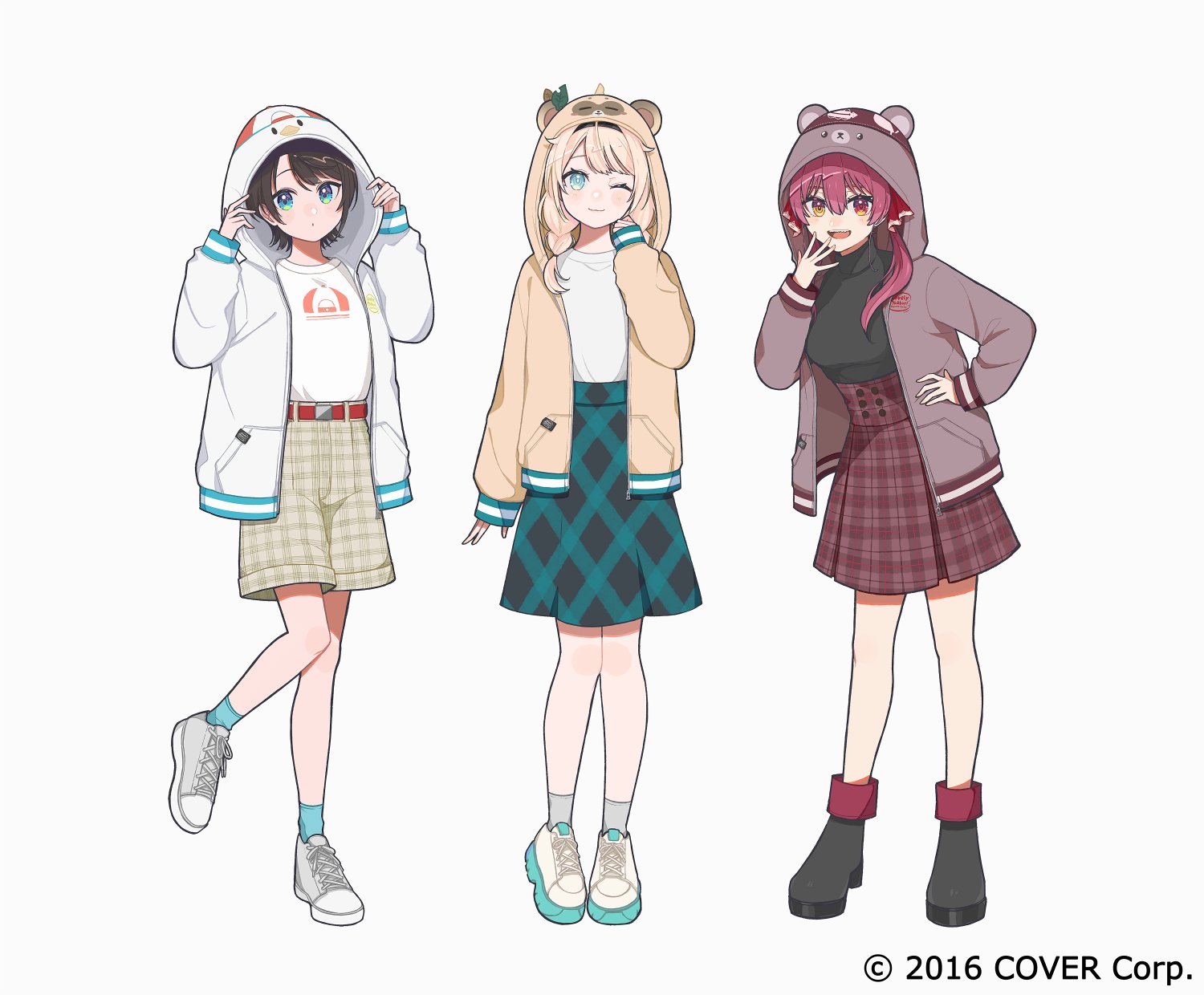 3girls :d ;) aqua_eyes belt black_boots black_hair black_hairband black_shirt blonde_hair blue_eyes blue_socks boots braid brown_jacket character_hood colored_shoe_soles commentary_request copyright_notice full_body grey_jacket grey_socks hair_ribbon hairband hand_on_own_hip hand_up heterochromia highres hololive hood hood_up houshou_marine jacket kazama_iroha kisaragi_yuu_(fallen_sky) long_hair looking_at_viewer low_twin_braids medium_hair multiple_girls official_art one_eye_closed oozora_subaru open_mouth plaid_clothes plaid_shorts plaid_skirt pokobee red_belt red_eyes red_hair red_ribbon ribbon shirt shirt_tucked_in shoes short_hair shorts simple_background skirt smile sneakers socks subaru_duck swept_bangs turtleneck twin_braids twintails virtual_youtuber white_background white_jacket white_shirt white_shoes yellow_eyes