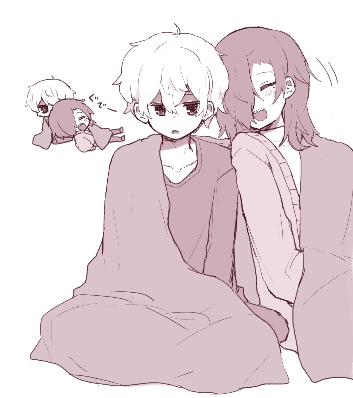 2boys :d ahoge annoyed brown_theme chibi chibi_inset closed_eyes collarbone hair_over_one_eye happy highres hyoutenka_30-do_no_zetsubou kuchinashi_dabi long_sleeves lying_on_person male_focus medium_hair monochrome multiple_boys multiple_views okudo61 one_eye_covered open_mouth pants reclining sepia shared_blanket sharp_teeth shirt short_hair sitting smile teeth tonimura_yui