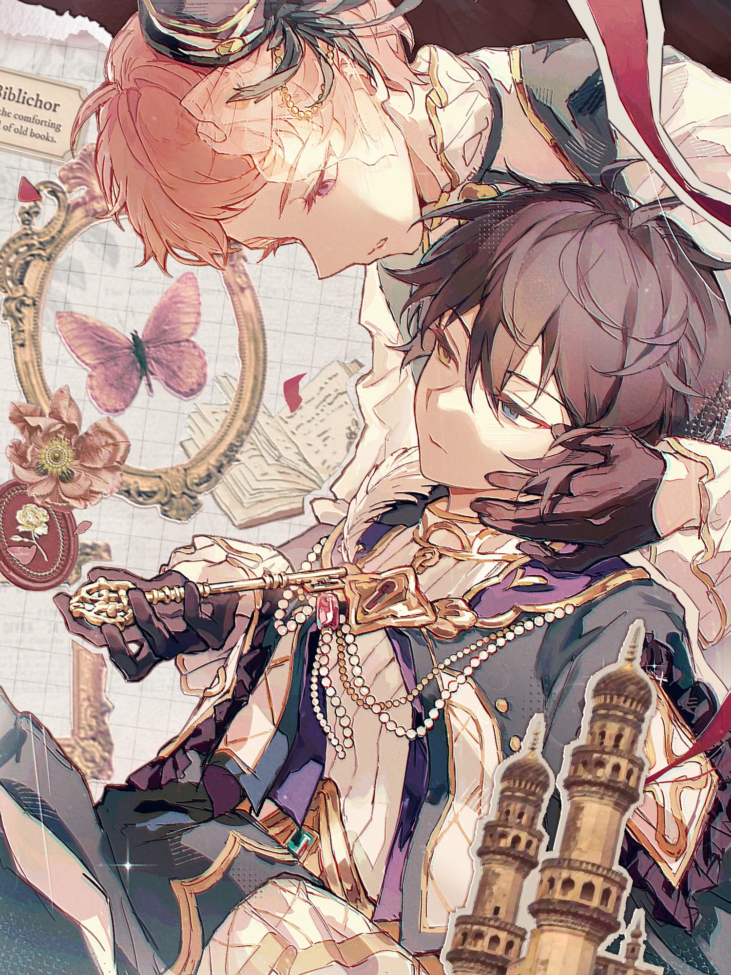 2boys black_gloves black_hair blue_eyes book bug building butterfly closed_mouth collar commentary cyanophose ensemble_stars! flower flower_request frilled_shirt_collar frilled_sleeves frills gloves hair_between_eyes hand_on_another's_face highres insect itsuki_shu kagehira_mika key keyhole long_sleeves male_focus multiple_boys official_alternate_costume open_book orugooru_(ensemble_stars!) parted_lips pink_hair short_hair untranslatable_commentary victoria_(ensemble_stars!) yaoi yellow_eyes
