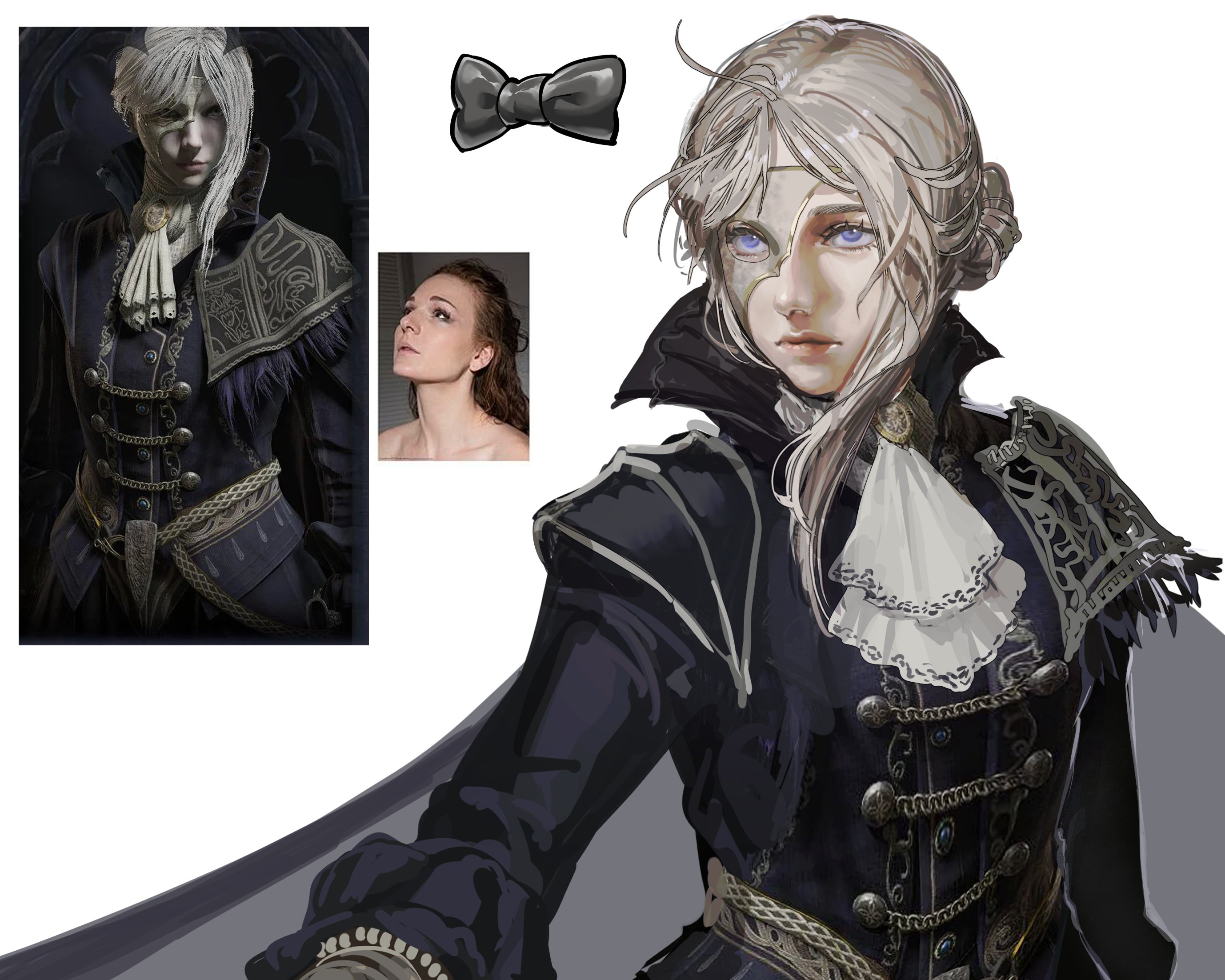 1girl ascot black_bow blue_coat blue_eyes blue_surcoat bow coat duchess_(elden_ring) elden_ring elden_ring_nightreign eye_mask game_screenshot_inset hair_bun half_eye_mask half_mask hanny_(uirusu_chan) high_collar highres mask ornate_clothes photo_inset screenshot_inset simple_background single_sidelock white_ascot white_background white_hair