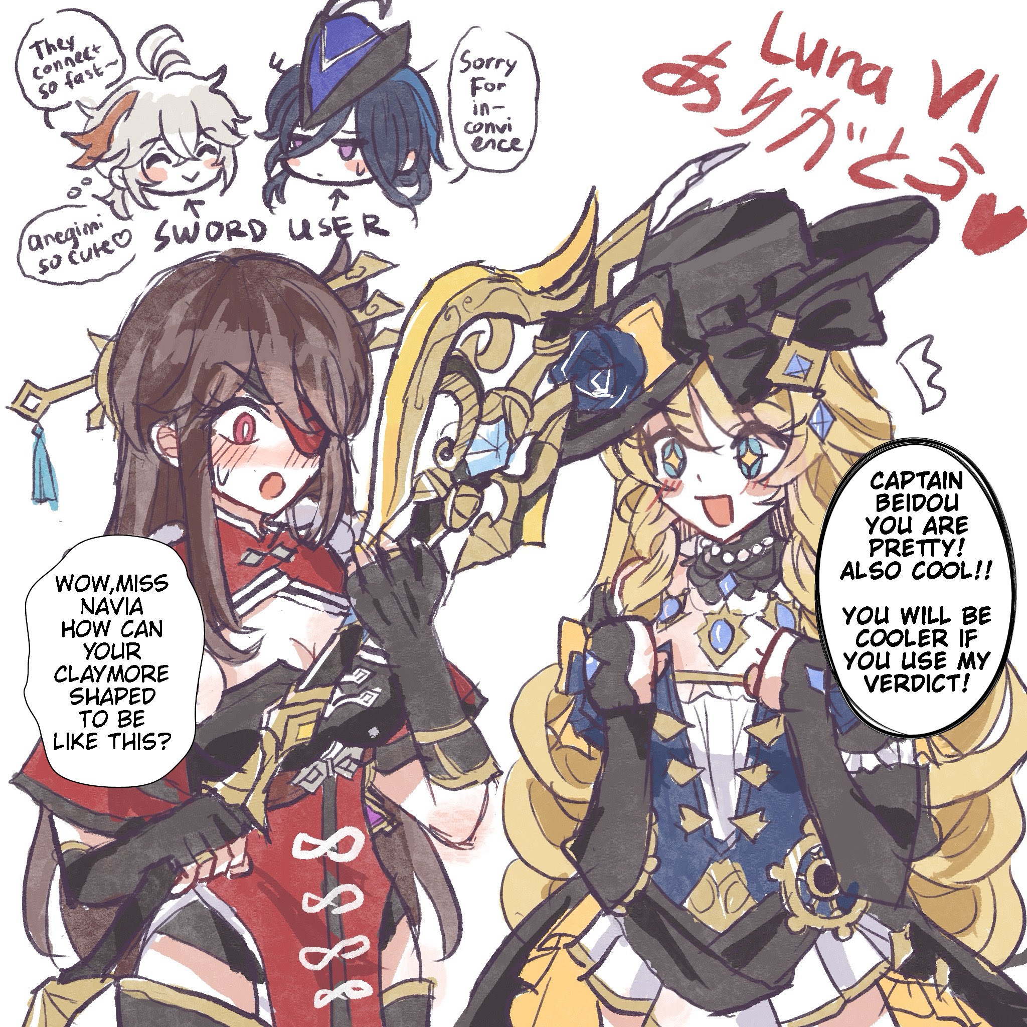 1boy 3girls antenna_hair beidou_(genshin_impact) black_hat black_leotard blonde_hair blue_eyes blue_gem blue_hair blush bodice boots breasts brown_hair china_dress chinese_clothes chinese_hairpin cleavage clenched_hands clorinde_(genshin_impact) closed_eyes colored_eyepatch commentary crossed_bangs dress drill_hair drill_sidelocks english_commentary english_text eyepatch fingerless_gloves flower gem genshin_impact gloves hair_ornament hair_over_one_eye hair_stick hat hat_feather hat_flower highres kaedehara_kazuha kasep lace-trimmed_collar lace_trim leotard long_hair multicolored_hair multiple_girls navia_(genshin_impact) one_eye_covered open_mouth pelvic_curtain purple_eyes red_eyes red_streaks sidelocks simple_background skirt speech_bubble strapless strapless_dress streaked_hair sweatdrop symbol-shaped_pupils thigh_boots tricorne verdict_(genshin_impact) very_long_hair white_background