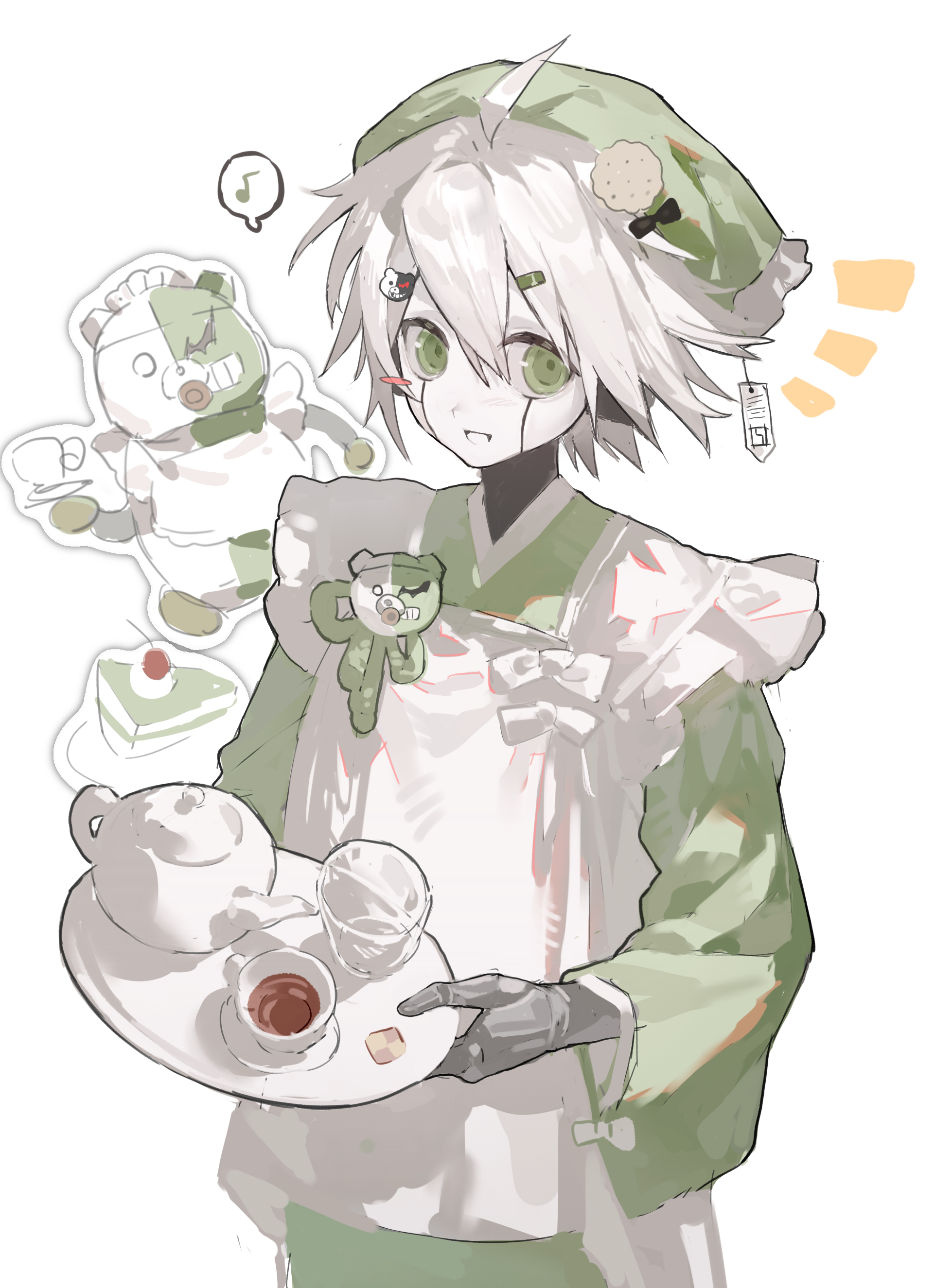 1boy absurdres ahoge alternate_costume apron black_bow blush_stickers bow cake cake_slice character_hair_ornament colored_skin cup danganronpa_(series) danganronpa_v3:_killing_harmony enmaided food green_eyes green_headscarf green_kimono hair_between_eyes hair_ornament hairclip headscarf highres holding holding_tray japanese_clothes k1-b0 kimono long_sleeves maid maid_headdress male_focus monodam monokuma musical_note notice_lines open_mouth short_hair simple_background smile speech_bubble spoken_musical_note tag tea teacup teapot tray wa_maid white_apron white_background white_bow white_skin xinjinjumin_9427850