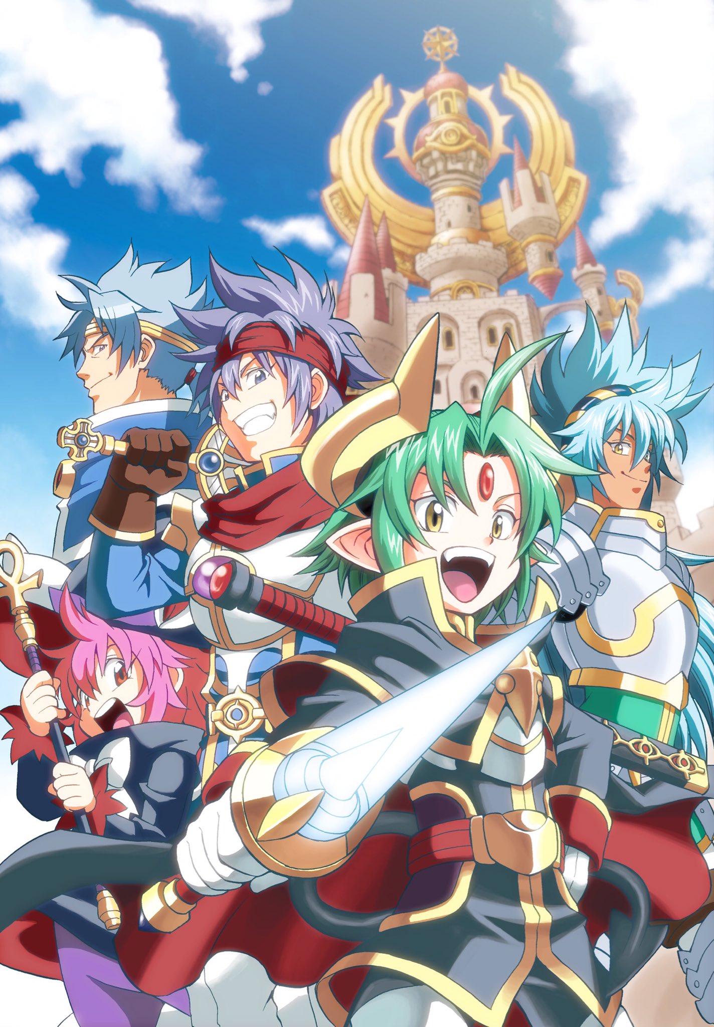2girls 3boys ark_mateus armor black_capelet black_coat black_dress black_tail blue_hair blue_sky brown_gloves capelet castle clenched_teeth closed_mouth cloud cloudy_sky coat commentary_request dark-skinned_female dark_skin demon_tail dress forehead_jewel gloves gold_headband gold_horns green_hair hat headband highres hiiro_brave holding holding_staff holding_sword holding_weapon ikusa_mitsurugi inoue_momota long_hair looking_at_viewer magiko_magika mahoutsukai_magiko mist_cross multiple_boys multiple_girls official_art open_mouth pants pink_hair pointy_ears purple_eyes purple_hair purple_pants red_eyes red_headband red_scarf scarf shinrabanshou short_hair sky smile staff sword tail teeth weapon white_gloves white_pants witch_hat yellow_eyes