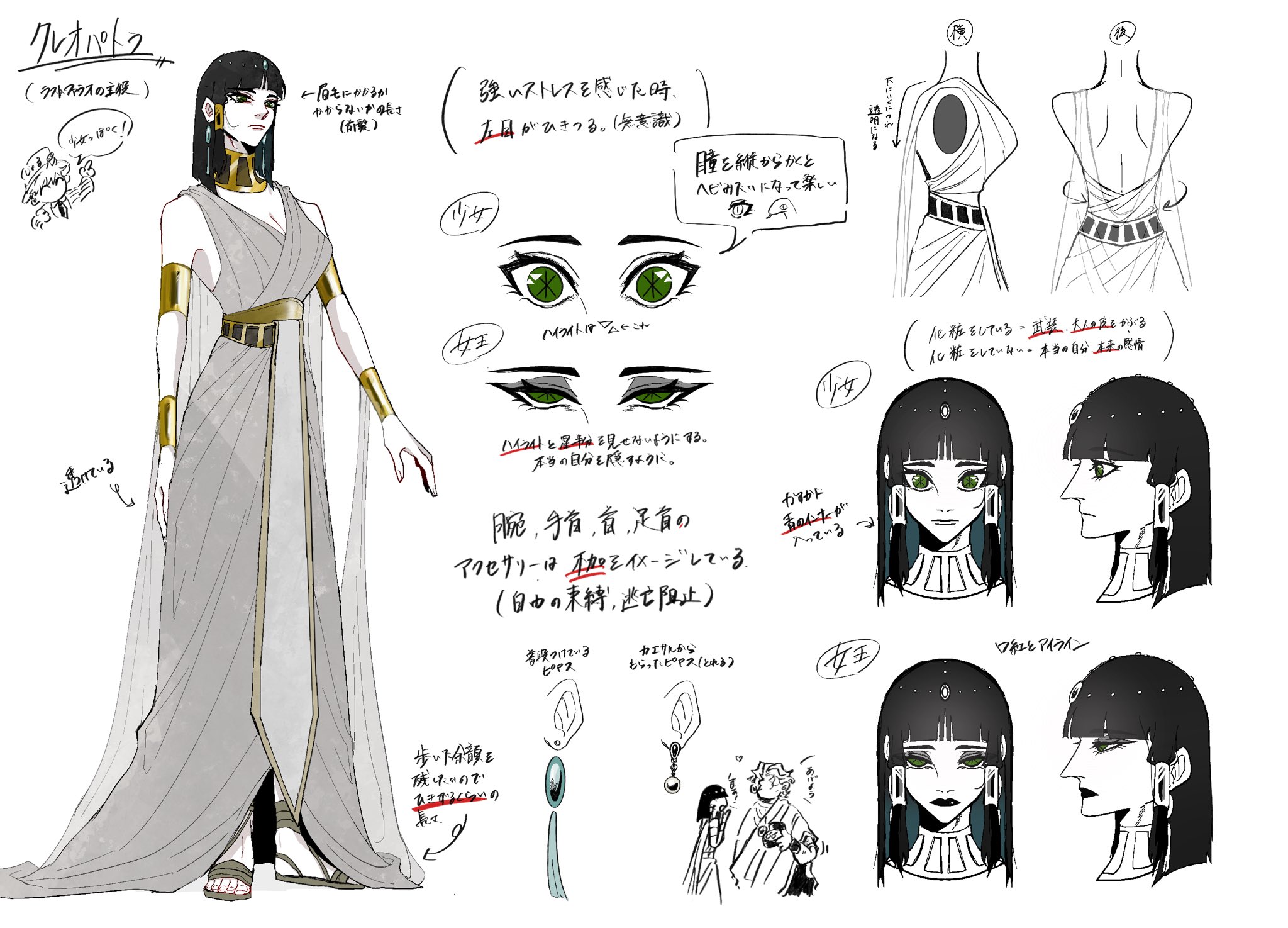 ancient_egyptian ancient_egyptian_clothes anklet armlet black_hair black_lips blunt_bangs breasts character_name cleavage cleopatra_(last_pharaoh) commentary commentary_request dress earrings eyeshadow facing_to_the_side facing_viewer full_body gold_anklet gold_armlet gold_wrist_cuffs green_eyes head_chain highres jewelry last_pharaoh long_nose looking_at_viewer looking_to_the_side makeup medium_hair multiple_expressions multiple_views notes official_art pharaoh pointing_out_the_details pointy_nose reference_sheet sandals simple_background standing star-shaped_pupils star_(symbol) straight-on symbol-shaped_pupils translation_request turnaround uno_0723 usekh_collar white_background white_dress