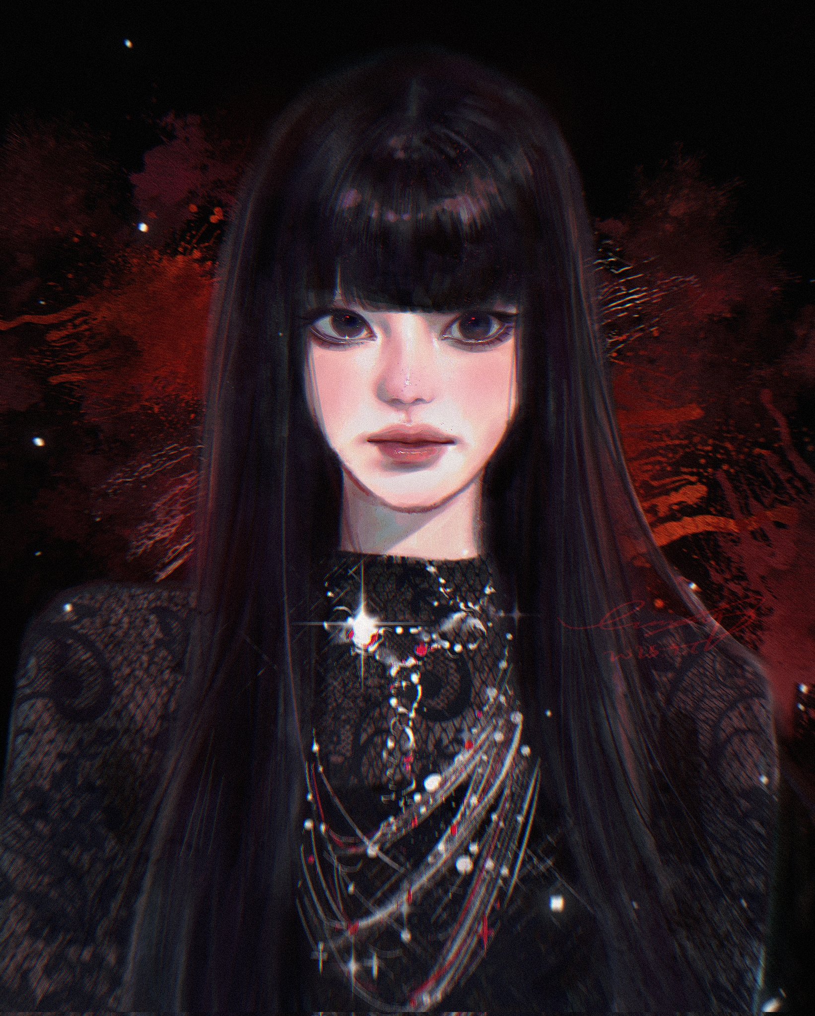 1girl aespa black_eyes black_hair black_shirt blunt_bangs blush commentary glint highres isin_yang jewelry k-pop long_hair looking_at_viewer necklace ningning_(aespa) portrait real_life red_lips shirt solo straight-on untranslatable_commentary