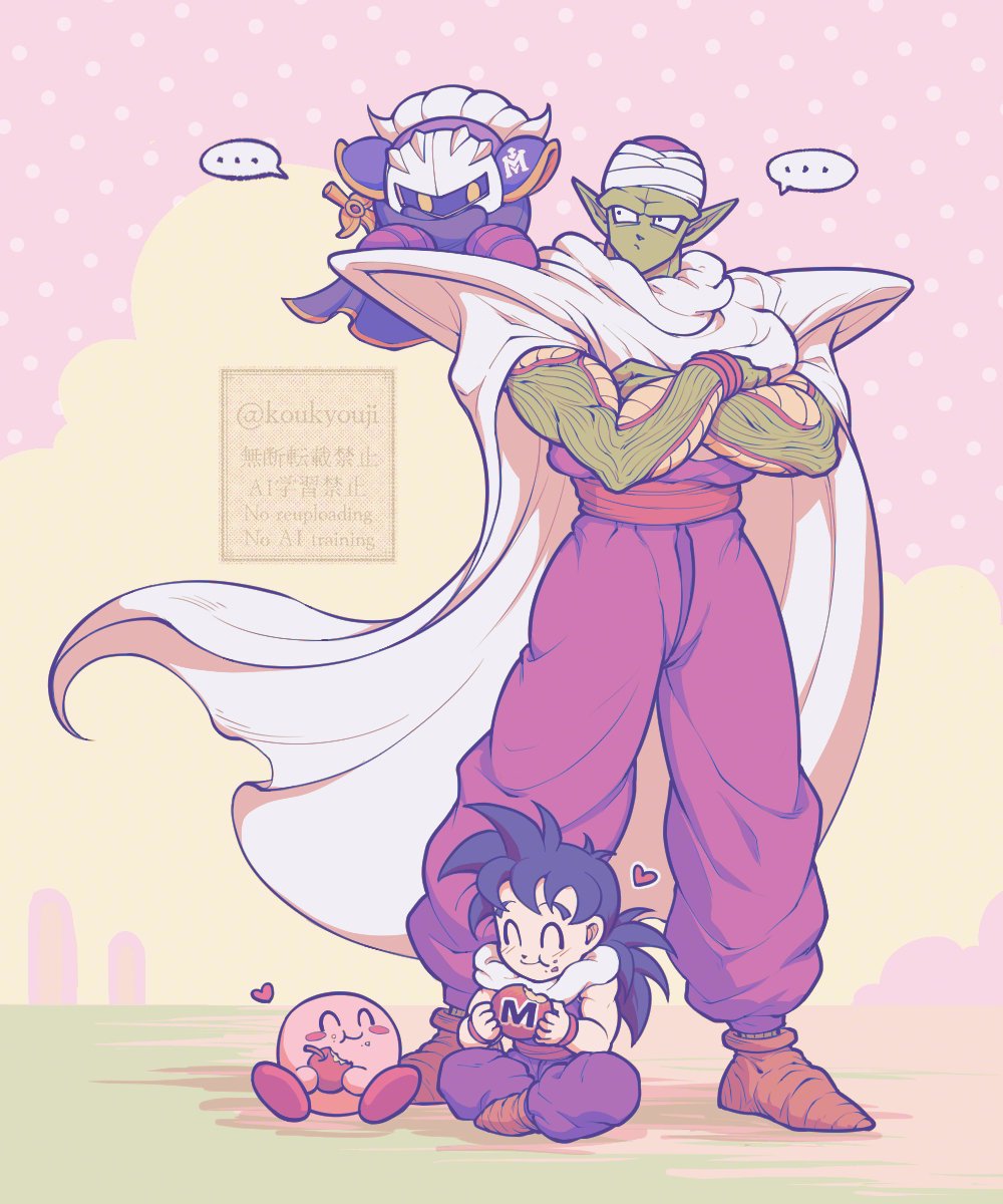 ... 2boys :/ ^_^ alien apple armor black_hair blush_stickers brown_shoes cape child closed_eyes closed_mouth cloud colored_skin commentary_request crossed_arms crossover dragon_ball dragonball_z eating floating_cape food food_on_face fruit full_body galaxia_(sword) green_skin heart highres holding holding_food holding_fruit indian_style kirby kirby_(series) koukyouji long_pointy_ears looking_at_another looking_to_the_side low_ponytail male_focus mask maxim_tomato medium_hair meta_knight multiple_boys namekian nintendo on_shoulder pants piccolo pink_background pink_skin pointy_ears polka_dot polka_dot_background ponytail purple_cape purple_pants purple_shirt red_sash red_shoes sash scarf shirt shoes shoulder_armor sitting sleeveless sleeveless_shirt smile solid_oval_eyes son_gohan spiked_hair spoken_ellipsis standing sword turban waist_sash watermark weapon white_cape white_scarf white_turban wristband yellow_eyes