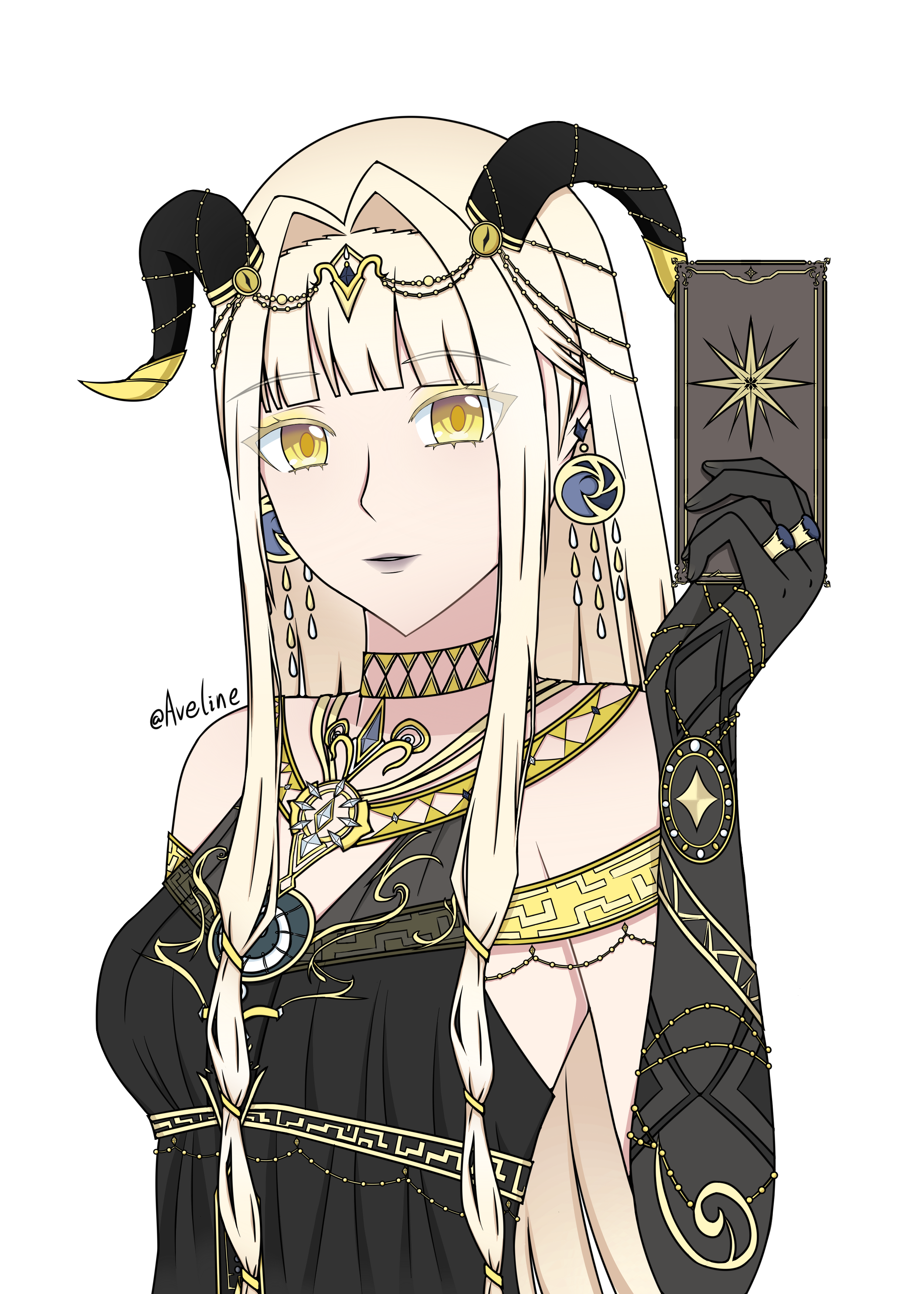1girl absurdres anlingjiang argyle_choker black_dress black_gloves black_horns blonde_hair blurry breasts card chinese_commentary choker colored_eyelashes commentary_request curled_horns dress earrings elbow_gloves expressionless eyes_visible_through_hair eyeshadow gloves goat_horns gold_necklace grey_lips hair_intakes hair_ribbon highres holding holding_card horns infinity_nikki jewelry light_smile lipstick long_hair long_sidelocks makeup multi-tied_hair multiple_rings necklace night_capricorn_song_(infinity_nikki) nikki_(series) parted_lips ribbon ring sidelocks signature simple_background sleeveless sleeveless_dress solo straight_hair tarot tarot_card tress_ribbon upper_body very_long_hair white_background yellow_choker yellow_eyes yellow_eyeshadow yellow_ribbon