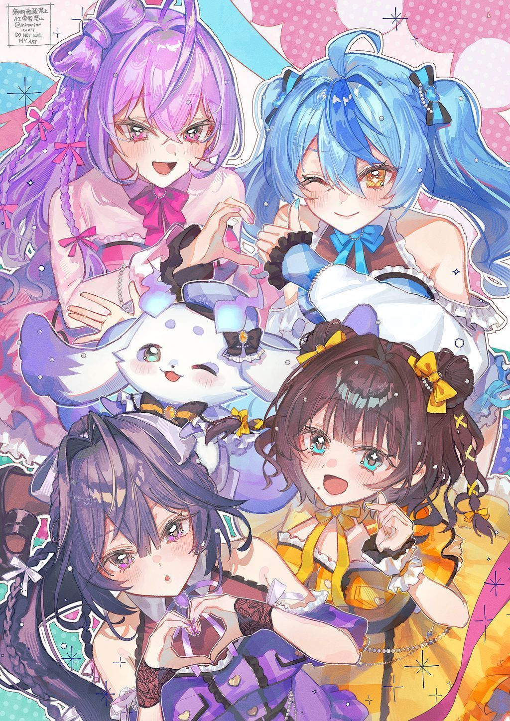 +_+ 1other 4girls :d :o ;d ahoge aqua_hair artist_name ayakaki_(nijisanji) bare_shoulders beret black_bow black_bowtie blue_bow blue_bowtie blue_dress blue_eyes blue_gem blue_hair blue_nails blush bow bow-shaped_hair bowtie braid brown_hair buttons center_frills cleavage_cutout closed_mouth clothing_cutout collared_dress colored_bangs commentary_request crossed_bangs detached_sleeves double-parted_bangs double_bun dress eyelashes finger_heart fingernails floating_hair frilled_sleeves frilled_wrist_cuffs frills gem gradient_hair grey_hair hair_between_eyes hair_bow hair_bun hair_intakes hair_ribbon hands_up hat heart heart_hands heart_hands_duo heart_hands_failure high_ponytail highres hinori_(hinorinr) kisara_(nijisanji) kozue_mone long_hair long_sleeves looking_at_viewer lunlun_(nijisanji) mole mole_under_mouth multicolored_hair multiple_braids multiple_girls nail_polish neck_ribbon nijisanji one_eye_closed open_mouth orange_gem outline pink_bow pink_bowtie pink_dress pink_eyes pink_gem pink_hair pink_nails pink_ribbon ponytail puffy_detached_sleeves puffy_short_sleeves puffy_sleeves purple_dress purple_eyes purple_gem purple_hair purple_hat purple_nails purple_ribbon purple_sleeves ribbon shiga_riko short_hair short_sleeves sidelocks single_hair_streak sleeveless sleeveless_dress smile sparkle streaked_hair tamanoi_nana teeth thumbs_up twintails twitter_username upper_teeth_only very_long_hair virtual_youtuber watermark wavy_hair white_bow white_outline white_ribbon white_sleeves wing_collar wrist_cuffs yellow_bow yellow_bowtie yellow_dress yellow_eyes yellow_gem yellow_nails yellow_ribbon