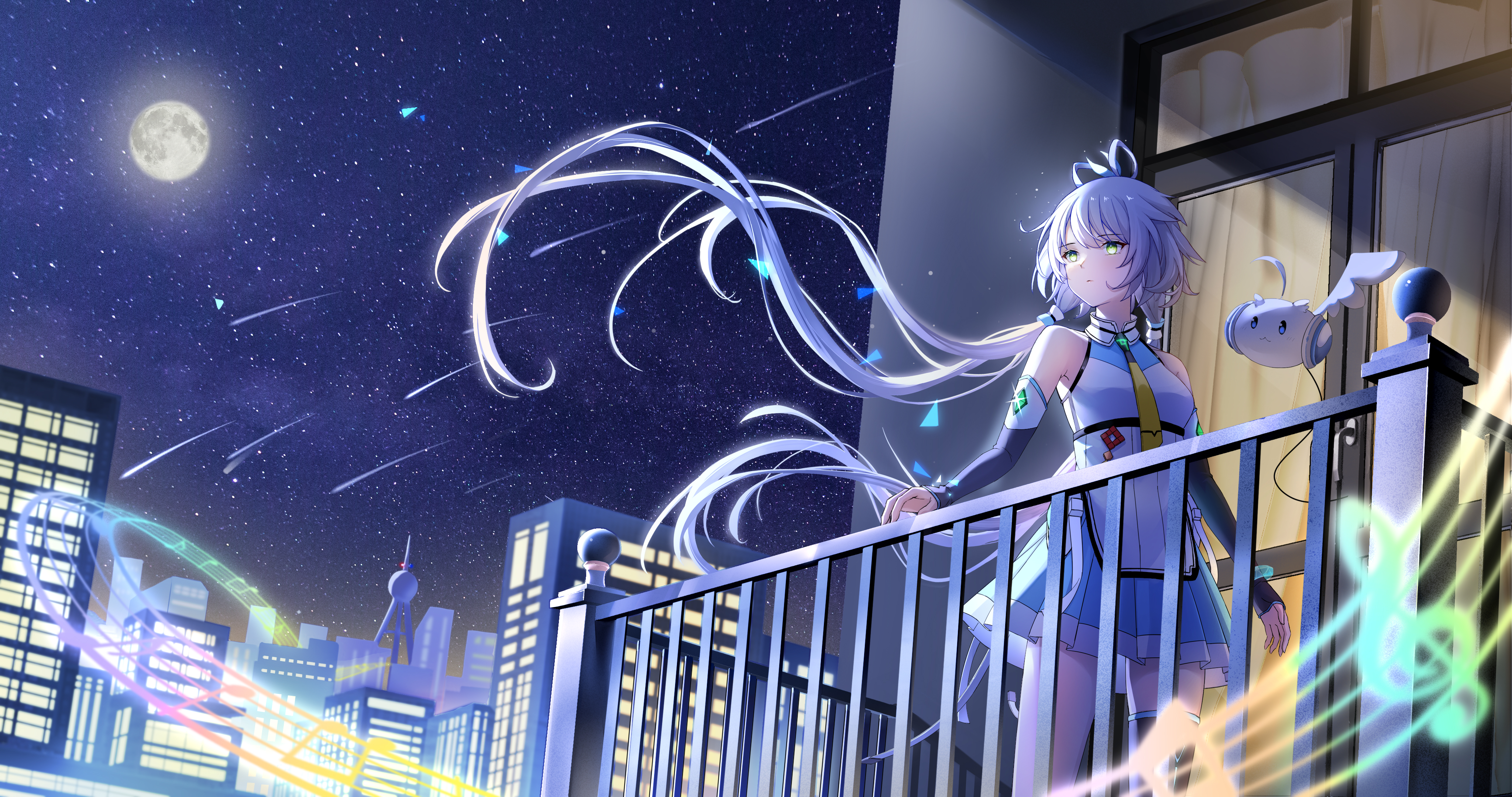 1girl absurdres asymmetrical_legwear balcony black_sleeves blue_skirt chinese_clothes commentary_request detached_sleeves feixianji_(hairstyle) green_eyes grey_hair hair_ornament hair_rings highres long_hair looking_ahead luo_tianyi luo_tianyi_(vocaloid4) moon night sheet_music shirt shooting_star short_hair_with_long_locks skirt tian_dian uneven_legwear vocaloid vsinger_(vocaloid) white_shirt yu_yi_connect