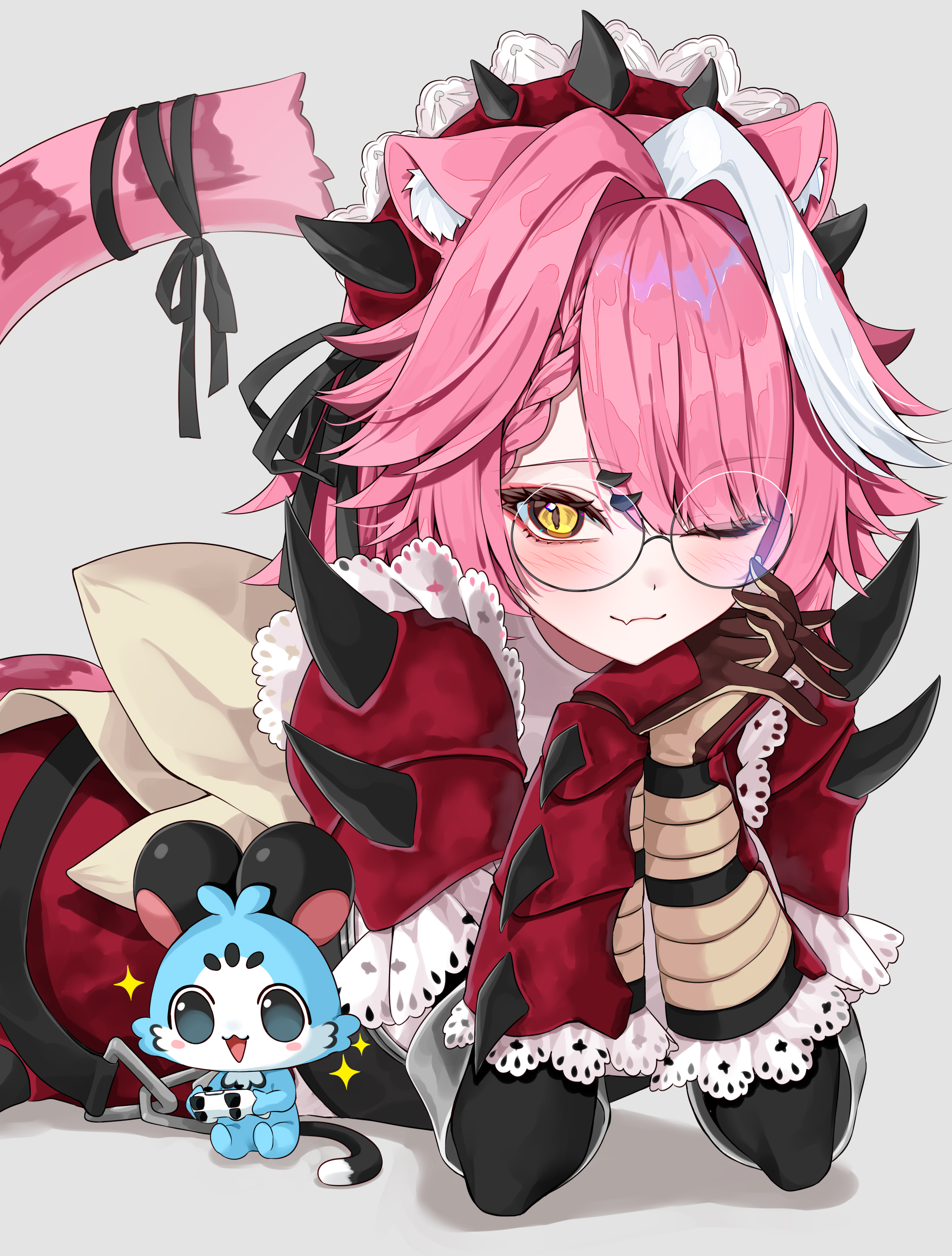 1girl ;3 absurdres animal_ears armor armored_dress braid braided_bangs chattino_(raora_panthera) commentary_request dress fang glasses grey_background hair_intakes hairband highres hololive hololive_english looking_at_viewer lying mogu_(au1127) multicolored_hair on_stomach one_eye_closed panther_ears panther_girl panther_tail partial_commentary pink_hair pointy_ears raora_panthera raora_panthera_(rathalos) red_dress round_eyewear short_hair shoulder_spikes simple_background skin_fang smile solo spiked_hairband spikes streaked_hair swept_bangs tail virtual_youtuber white_streaks yellow_eyes