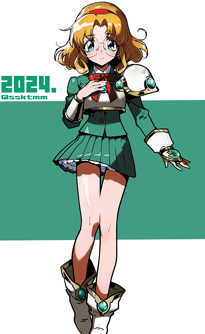 1girl armor artist_name blonde_hair breastplate commentary dated green_background green_eyes green_jacket green_skirt hairband hououji_fuu jacket layered_skirt looking_at_viewer magic_knight_rayearth medium_hair pleated_skirt red_hairband round_eyewear sasaki_tomomi single_shoulder_pad skirt smile solo