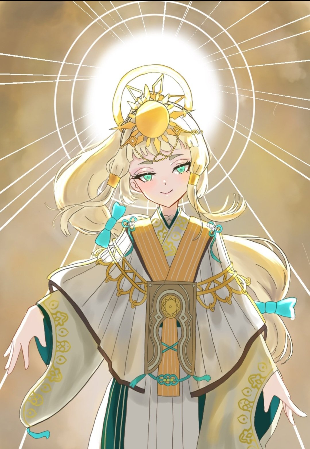 1girl blunt_bangs commentary_request hair_tubes head_chain highres japanese_clothes jewelry kanata_(rune_factory) kimono looking_at_viewer metal_hair_tubes multicolored_kimono rune_factory rune_factory:_guardians_of_azuma smile solo sun_hair_ornament vmzdzxnx7fiyoxx white_kimono