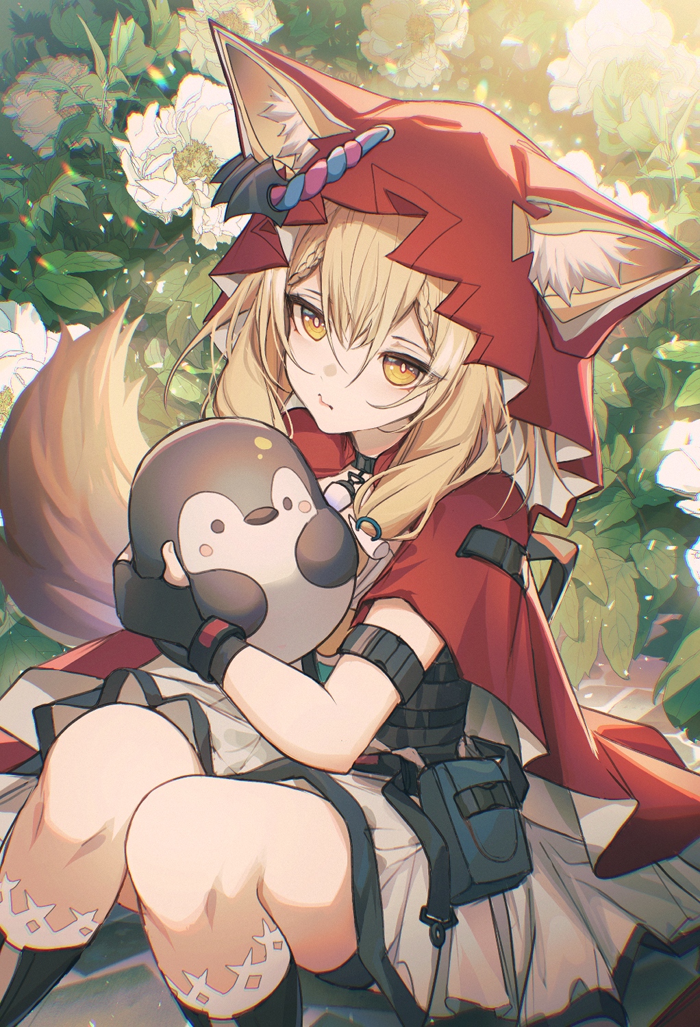 1girl animal_ear_fluff animal_ears arknights arknights:_endfield blonde_hair cape closed_mouth commentary dress ears_through_headwear ev-oo gloves highres holding holding_stuffed_toy hood hood_up hooded_cape red_cape rossi_(arknights) short_dress sitting solo stuffed_animal stuffed_penguin stuffed_toy tail white_dress wolf_ears wolf_girl wolf_tail yellow_eyes