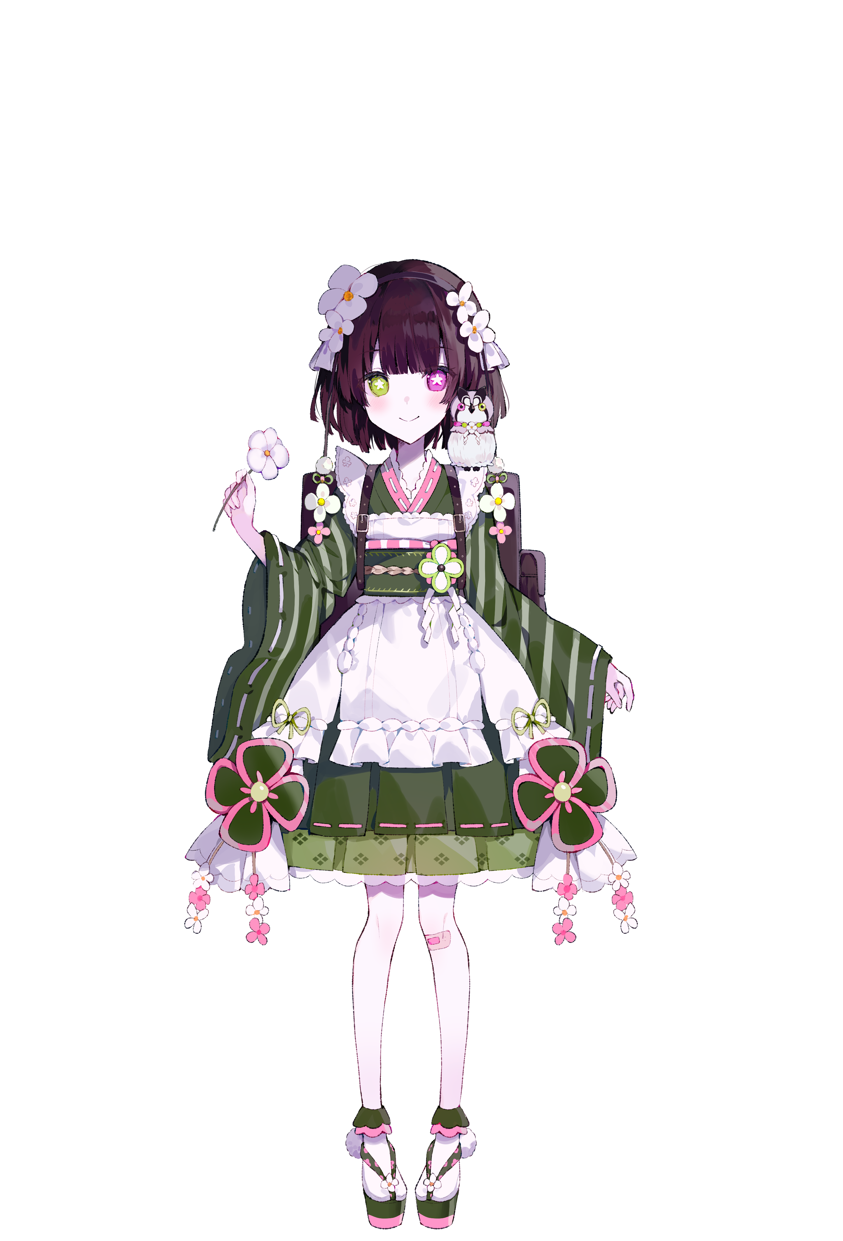1girl absurdres awawa_yumemi backpack bag bandaid bandaid_on_knee bandaid_on_leg bird brown_hair dress flower flower_hairband frilled_dress frills green_dress green_eyes green_kimono heterochromia highres holding holding_flower japanese_clothes kimono mahou_shoujo_no_inshuu_mura obi official_art owl pink_eyes pink_flower sandals sash second-party_source short_hair smile socks solo star-shaped_pupils star_(symbol) symbol-shaped_pupils tachi-e two-tone_sandals umemaro_(siona0908) white_flower white_socks